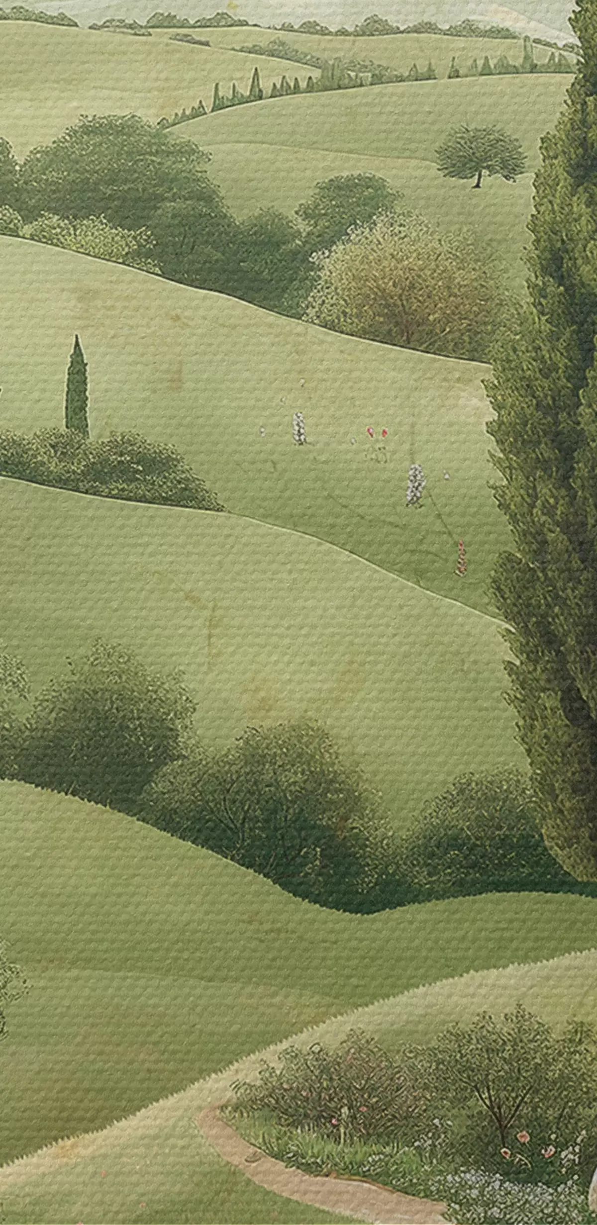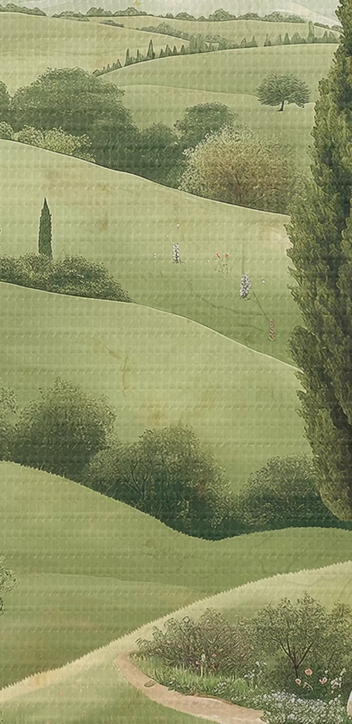 Fototapete Toskanische Landschaft, Vintage-Stil, pastellgrüne Farben, Hügel und Bäume s40075