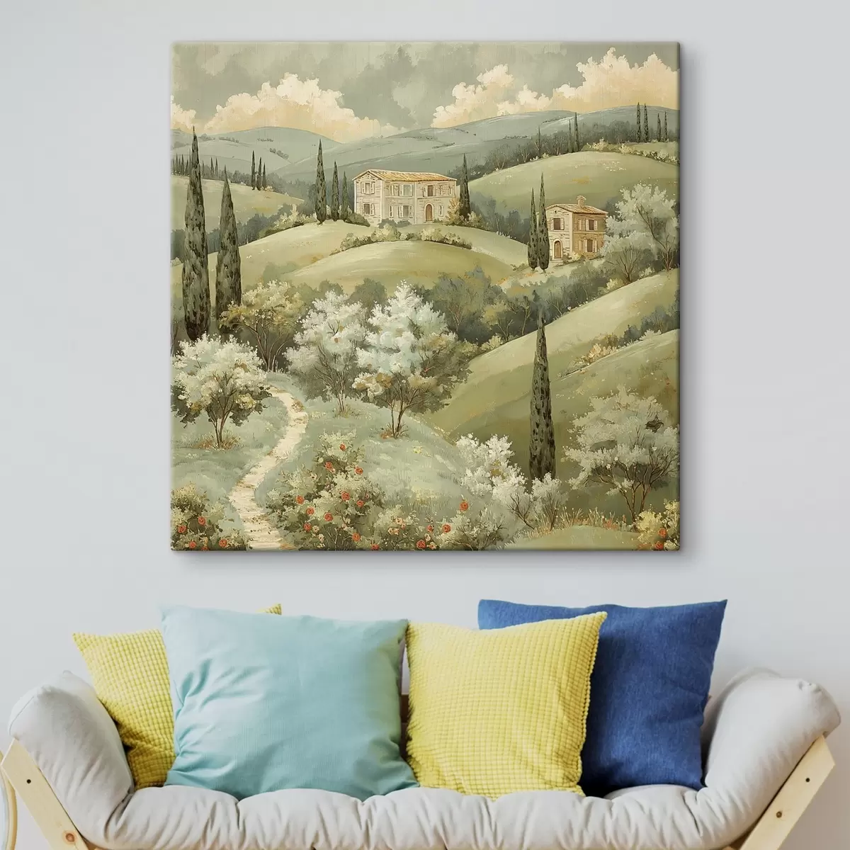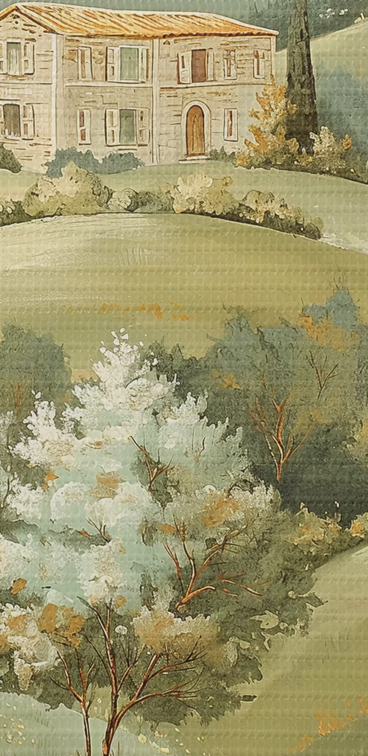 Fototapete Landschaft mit Vintage-Häusern, pastellgrüne Farben, Acrylzeichnung, Sommer s40078