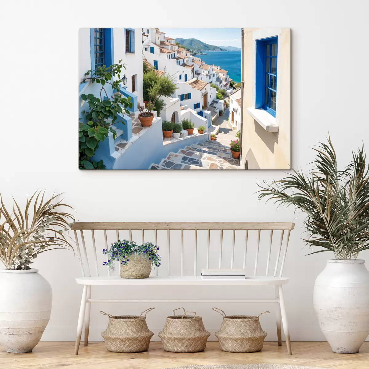 Gemälde Eine malerische Küstenstadt mit weißen Gebäuden, blauen Fenstern und Topfpflanzen entlang der engen Gassen Art. s40148
