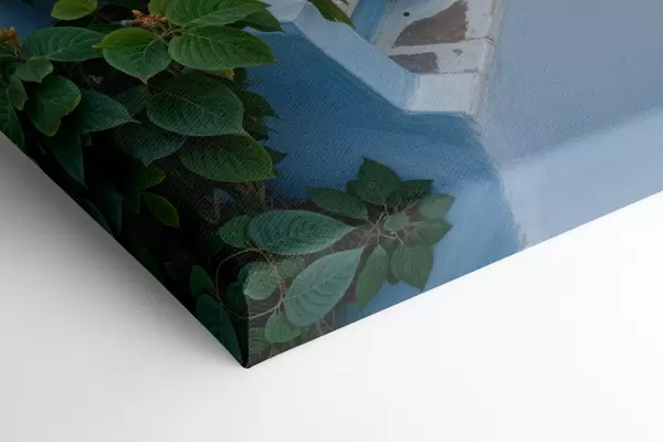 Gemälde Eine malerische Küstenstadt mit weißen Gebäuden, blauen Fenstern und Topfpflanzen entlang der engen Gassen Art. s40148