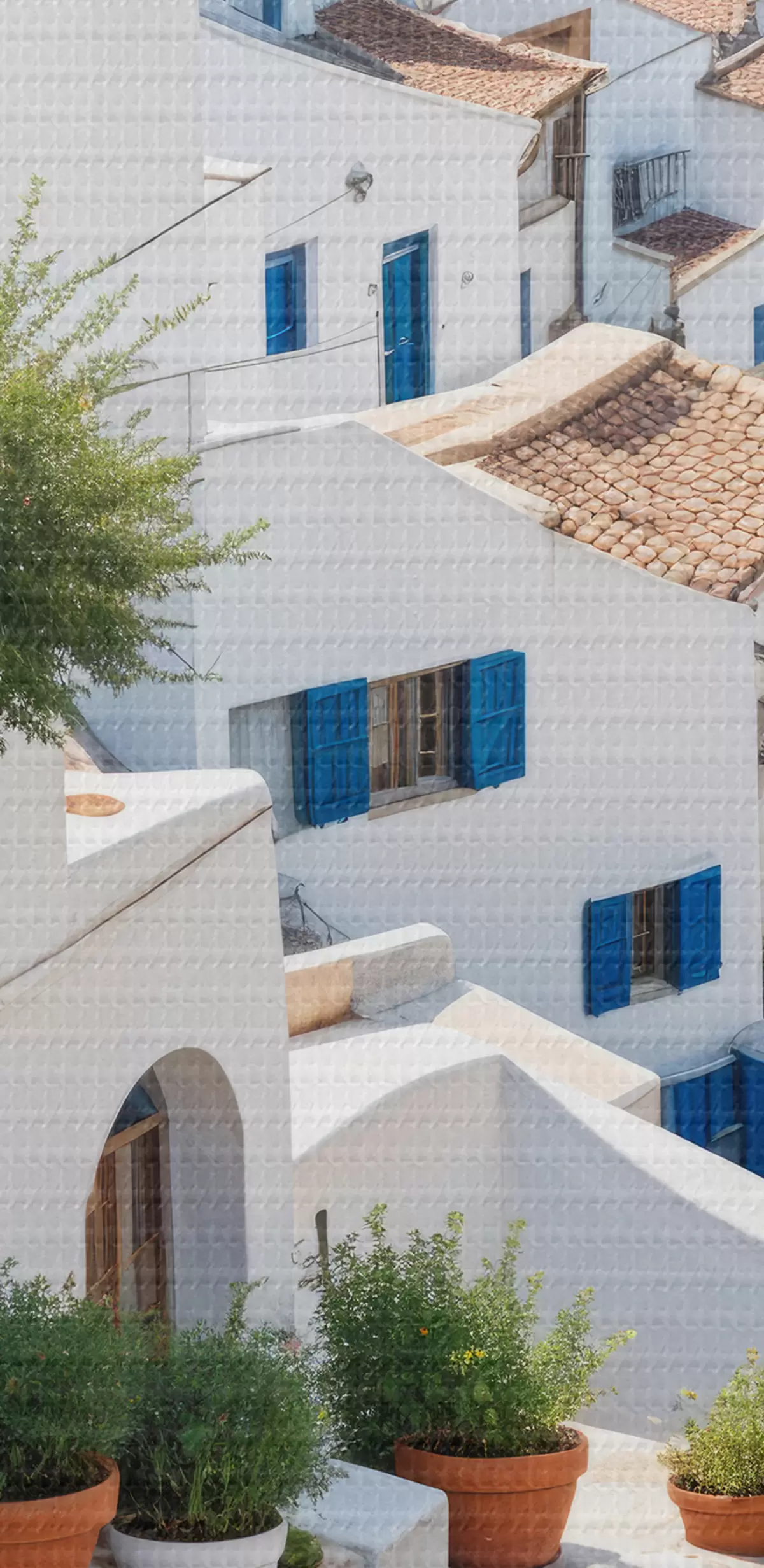Fototapete Eine malerische Küstenstadt mit weißen Gebäuden, blauen Fenstern und Topfpflanzen entlang der engen Gassen  s40148