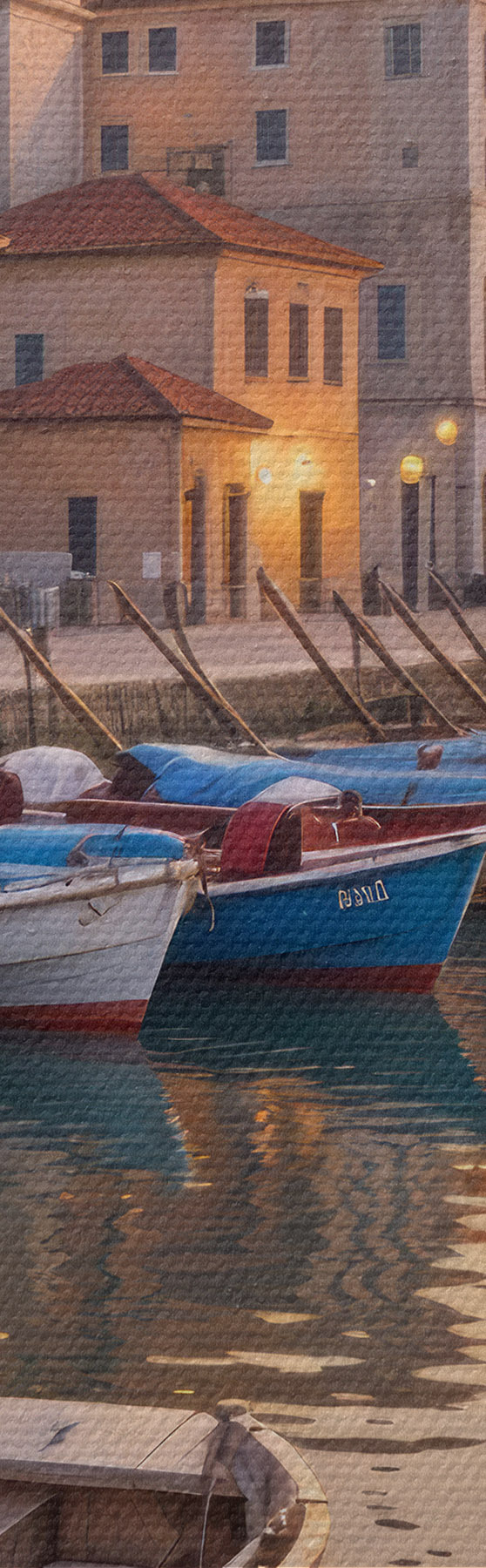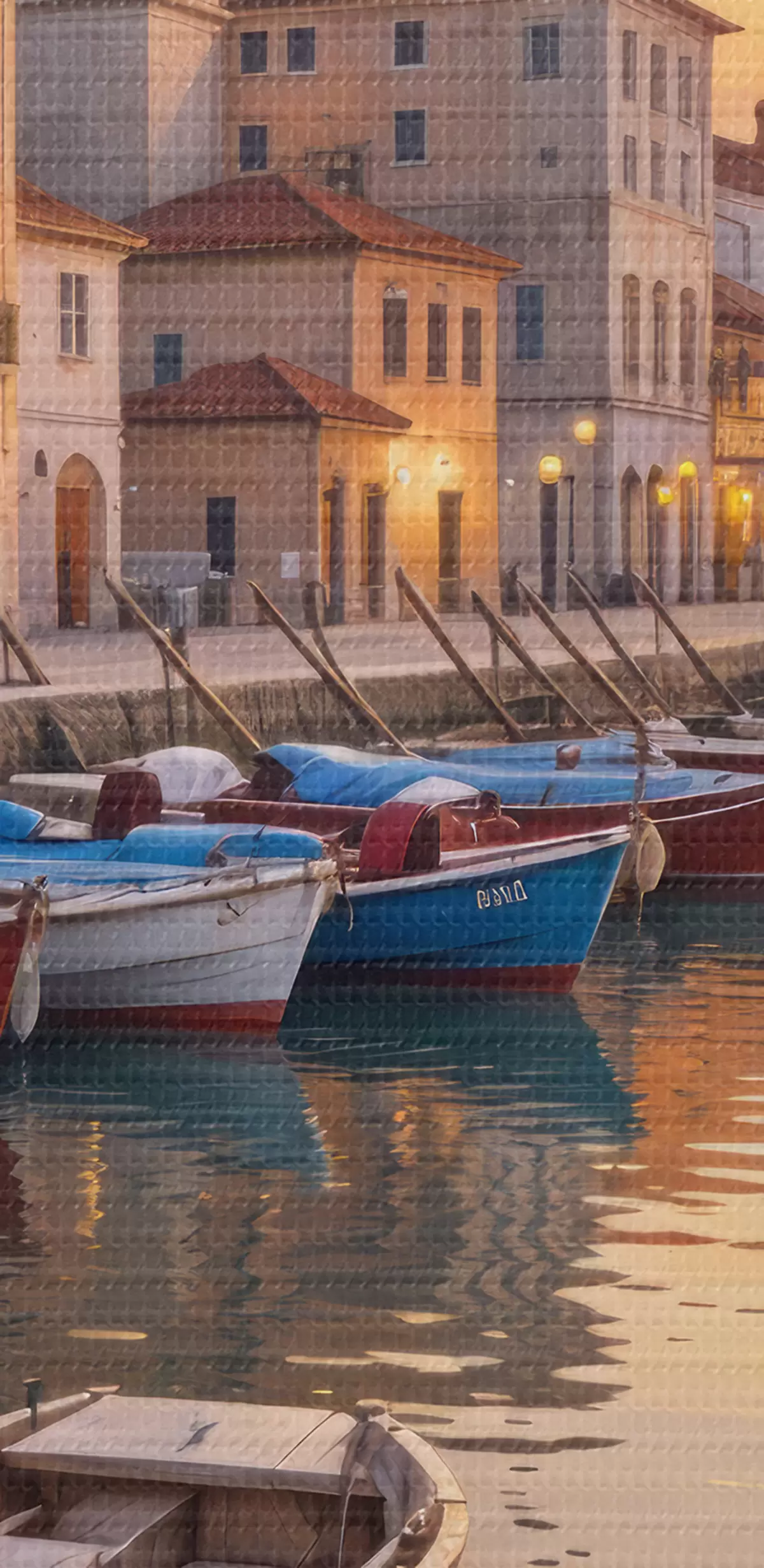Fototapete Italienische Küstenstadt bei Sonnenuntergang, mit farbenfrohen Gebäuden entlang der Uferpromenade und Booten, die im ruhigen Wasser treiben s40150
