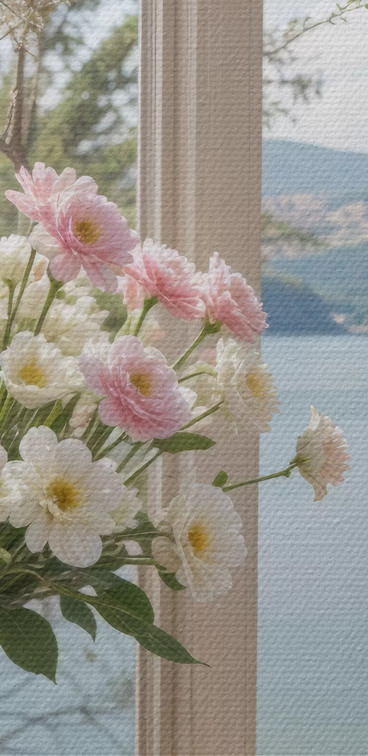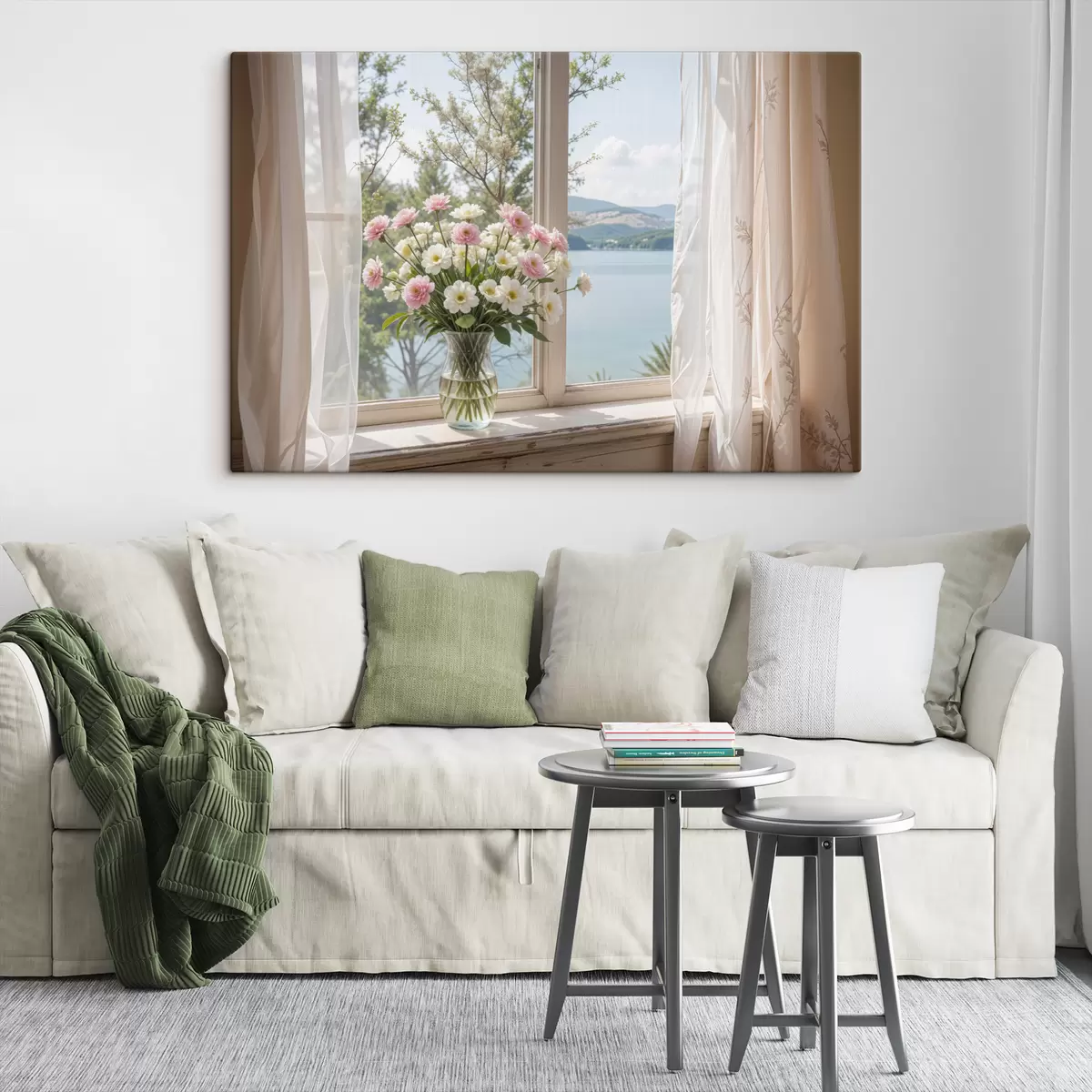 Gemälde Ein Strauß rosafarbener und weißer Blumen in einer Glasvase auf einer Fensterbank mit malerischem Blick auf See und Berge Art. s40151