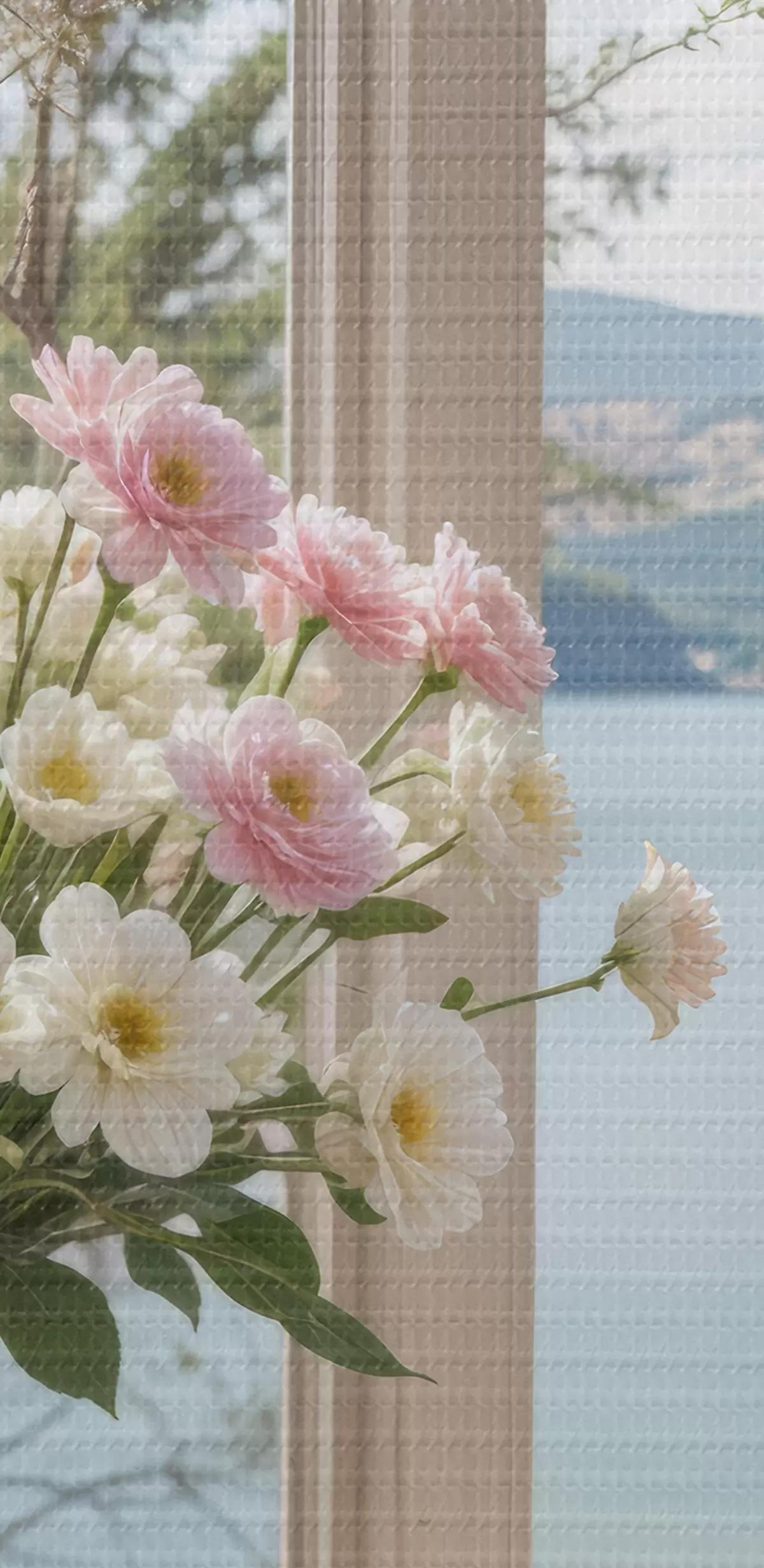 Fototapete Ein Strauß rosafarbener und weißer Blumen in einer Glasvase auf einer Fensterbank mit malerischem Blick auf See und Berge  s40151