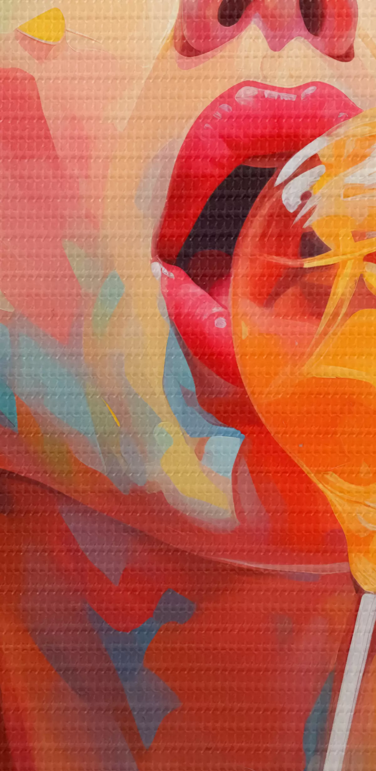 Fototapete Mädchen mit lockigem Haar in leuchtenden Farben leckt Lutscher s40213