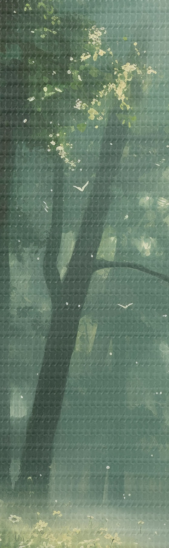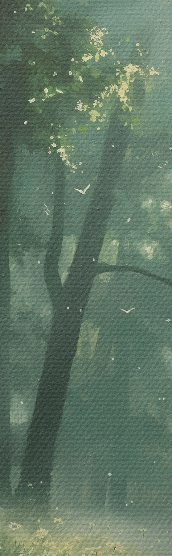 Gemälde Dichter Wald mit Sonnenlicht in den Bäumen, Kamillenblüten, grünem Gras, Natur Art. s40224