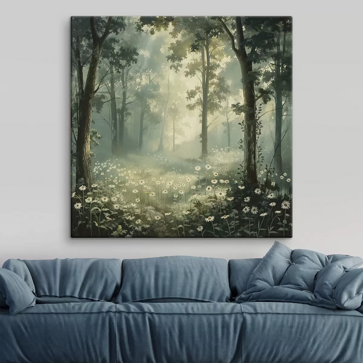 Gemälde Wald mit sanftem Sonnenlicht, Kamillenblüten, Bäumen, grünem Gras, Acrylzeichnung Art. s40228
