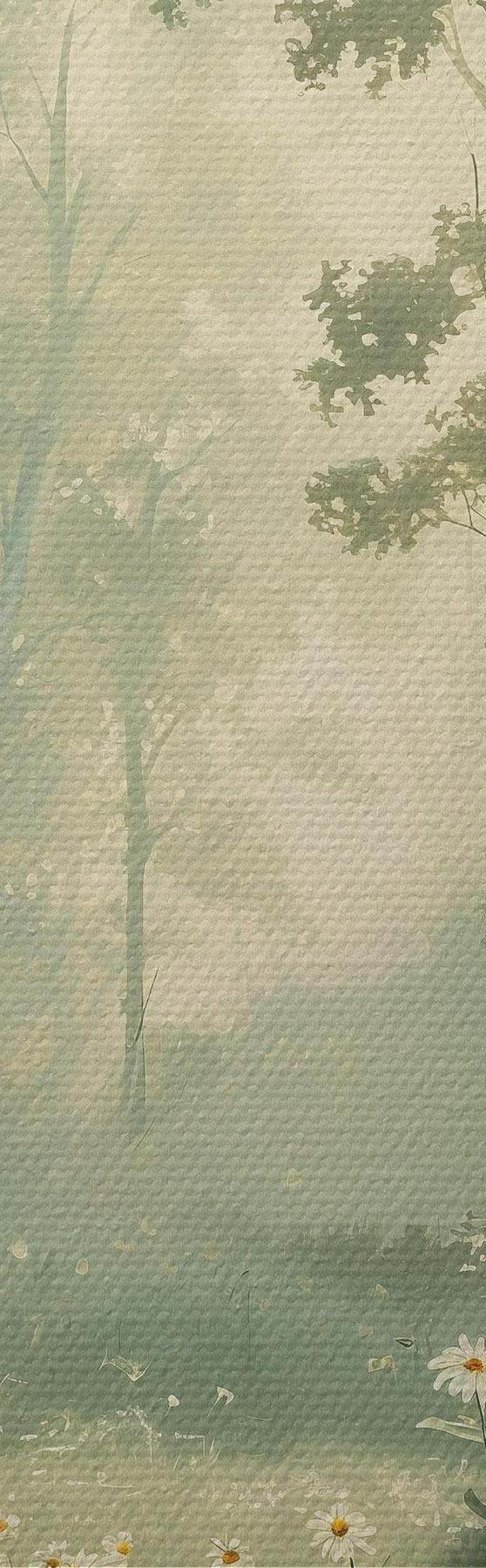 Fototapete Wald mit sanftem Sonnenlicht, Kamillenblüten, Bäumen, grünem Gras, Acrylzeichnung s40228