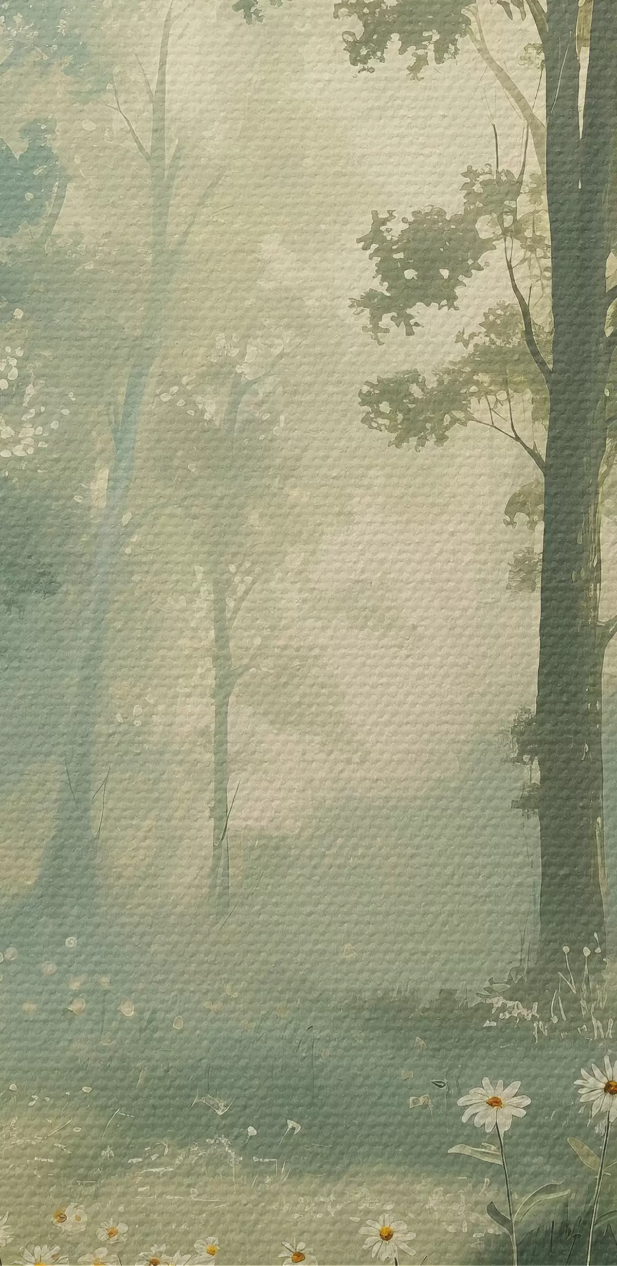 Fototapete Wald mit sanftem Sonnenlicht, Kamillenblüten, Bäumen, grünem Gras, Acrylzeichnung s40228