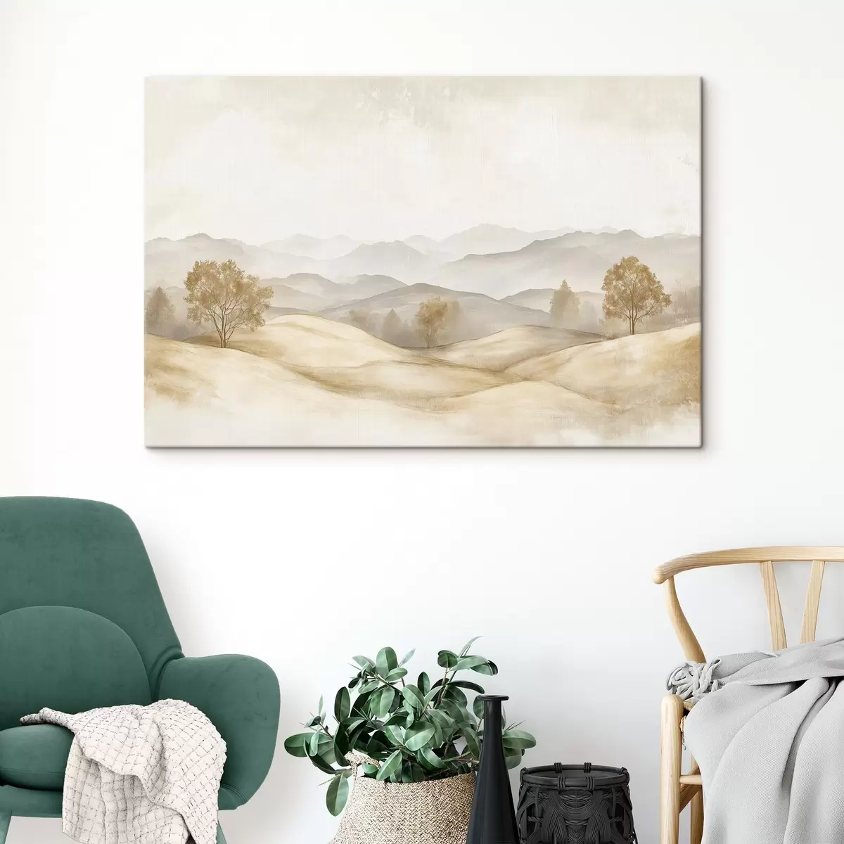 Fototapete Naturlandschaft in beiger Farbpalette, Wiese, Bäume, Aquarellzeichnung s40231