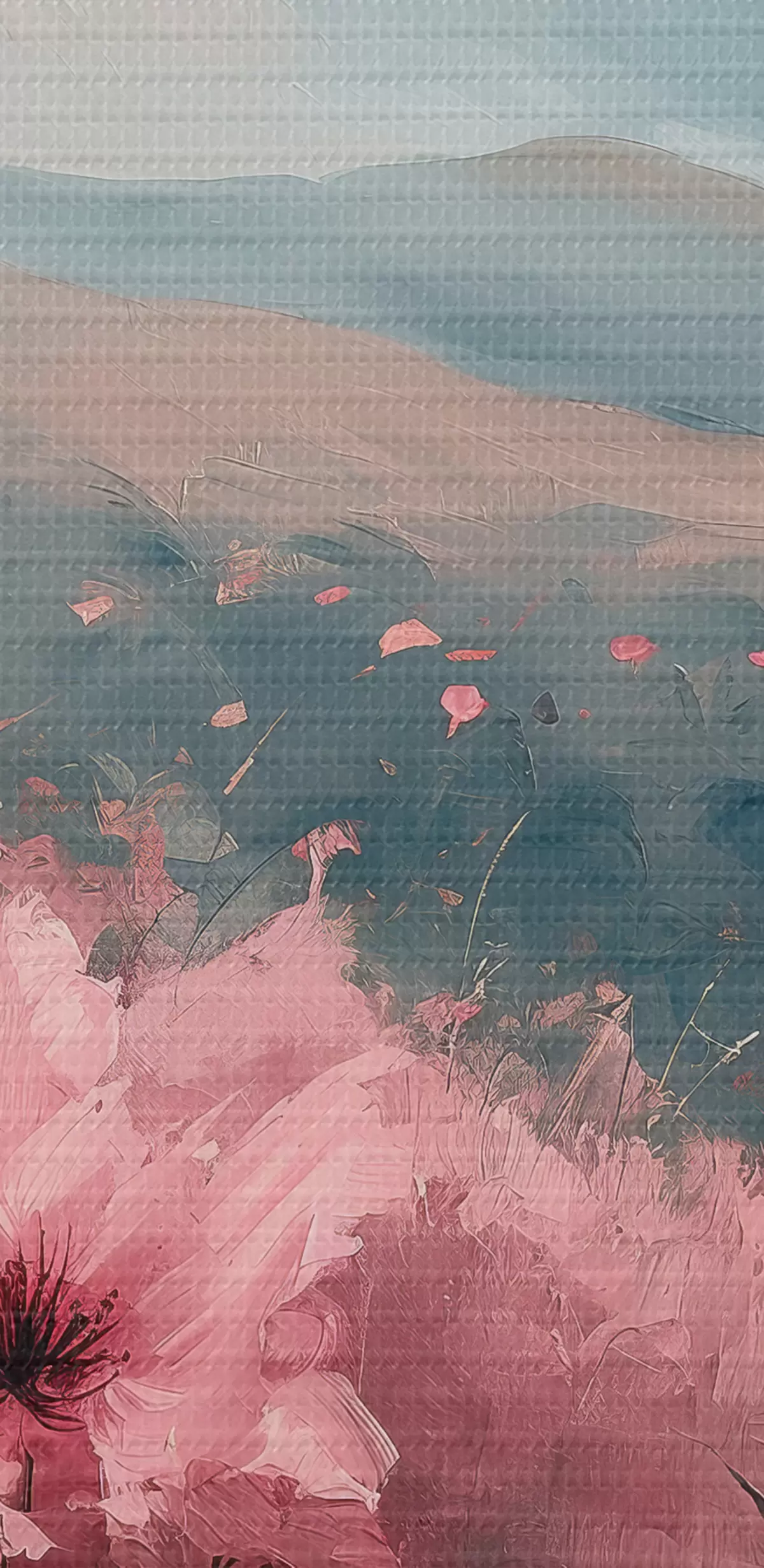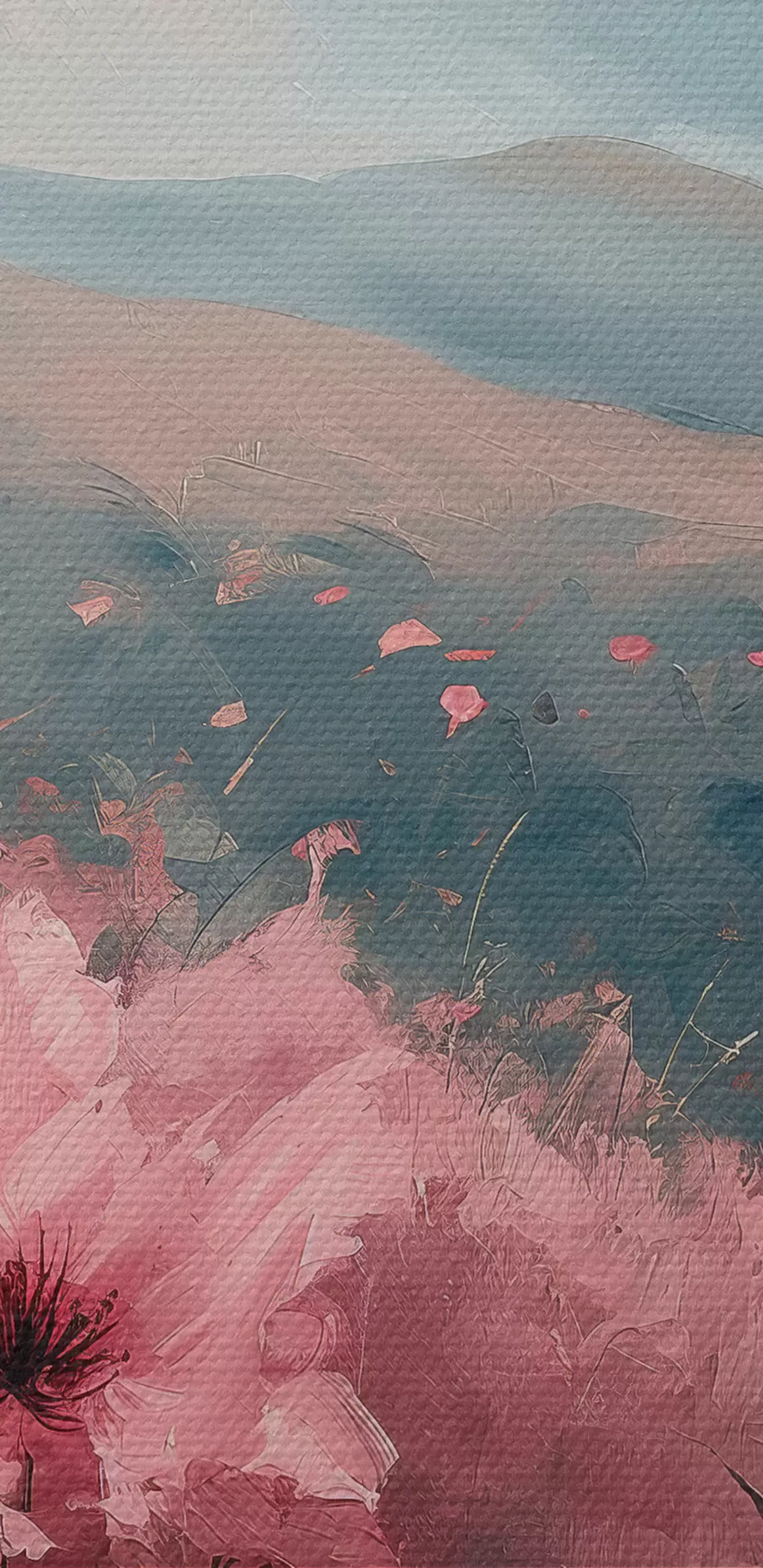 Fototapete Rosa Blumen auf der Wiese, Naturlandschaft, Berge, Ölgemälde, lebendige Pinselstriche s40233