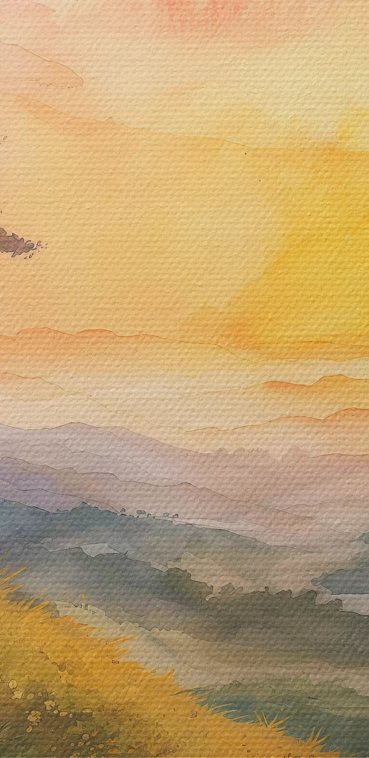 Gemälde Wiese mit Hügeln und Baum, Blumen, Aquarell Art. s40303