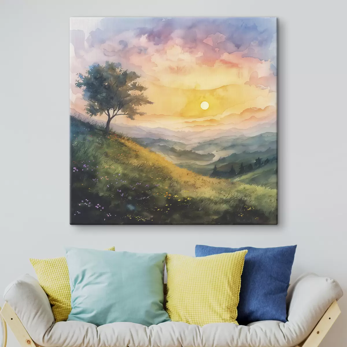 Gemälde Wiese mit Hügeln und Baum, Blumen, Aquarell Art. s40303