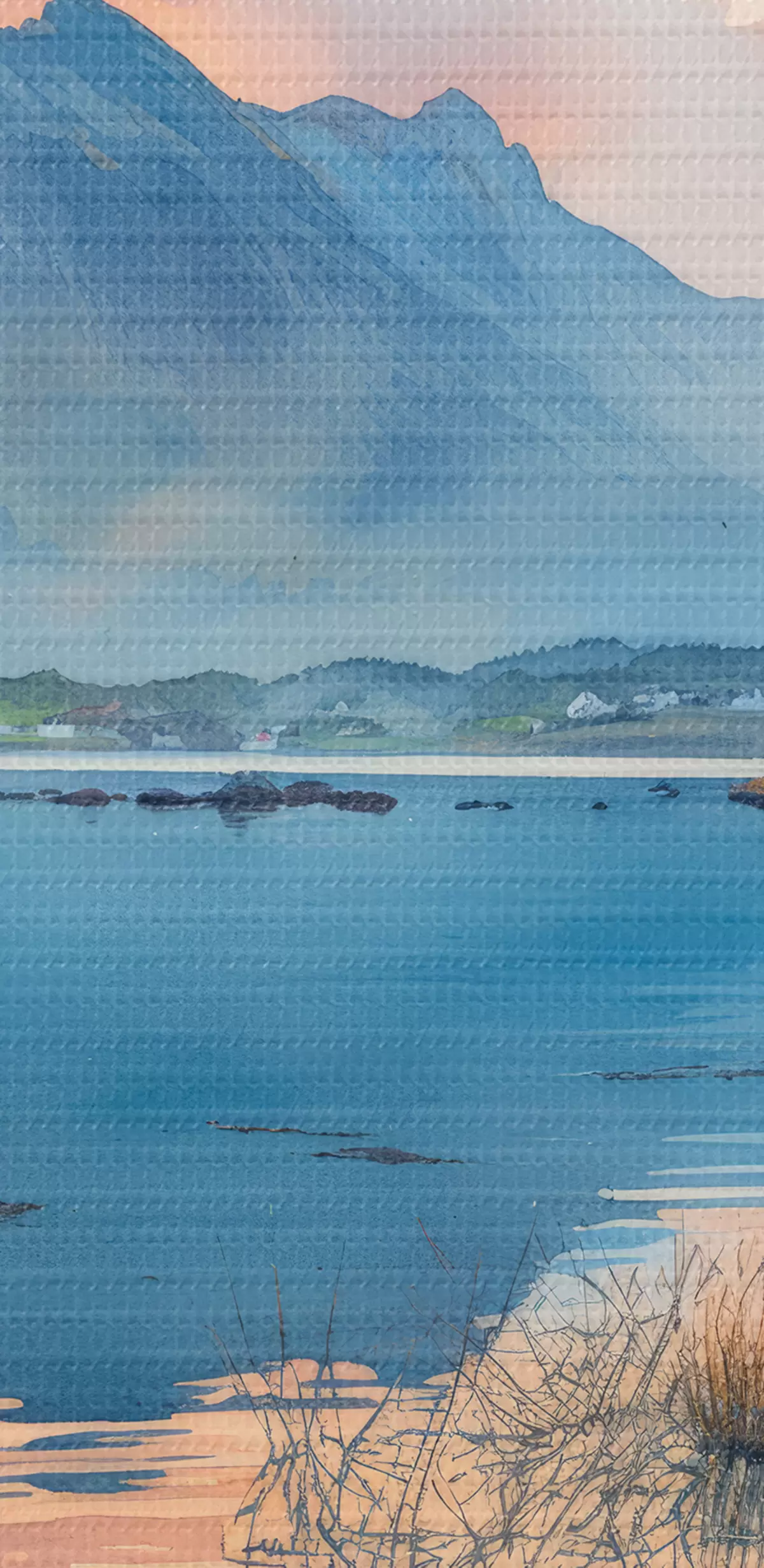 Gemälde Ruhiger Fluss mit Bergen, Sonnenaufgang, sanfte Farben Art. s40307