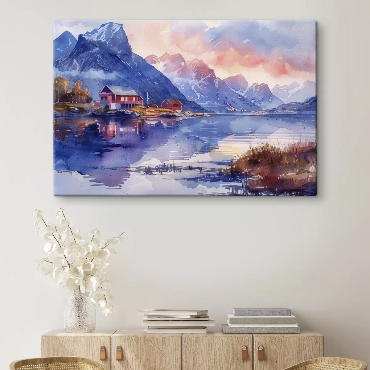 Fototapete Norwegen Dorf, Sonnenuntergang Himmel, ruhigen Fluss, Berge, Aquarell s40311