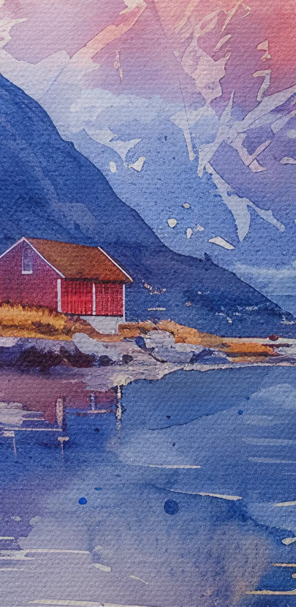 Gemälde Norwegen Dorf, Sonnenuntergang Himmel, ruhigen Fluss, Berge, Aquarell Art. s40311