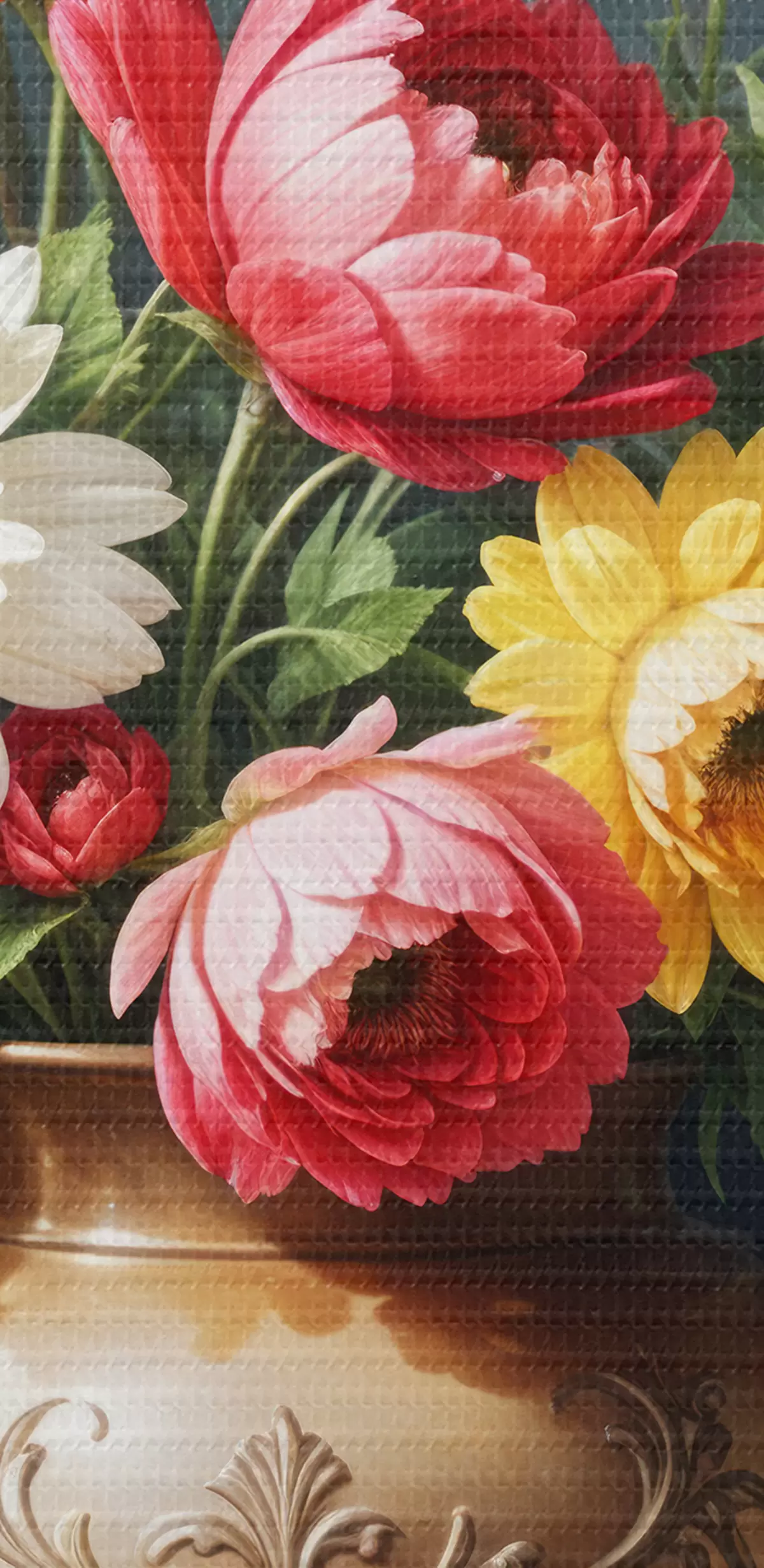 Gemälde Ein lebendiges Gemälde eines Straußes bunter Blumen, darunter rote Rosen, gelbe Narzissen und weiße Gänseblümchen Art. s40395
