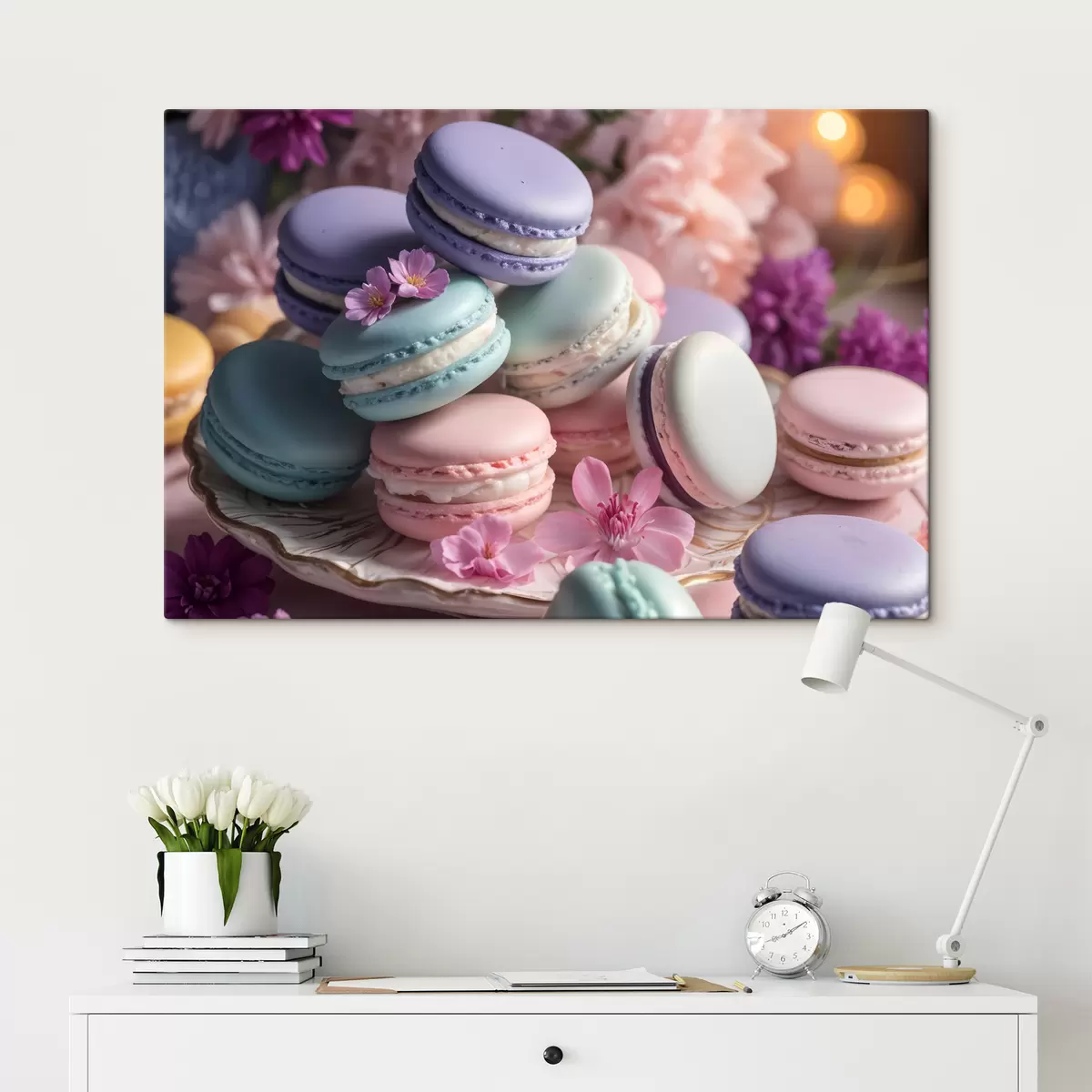 Gemälde Bunte Macarons mit rosa und lila Blüten auf einem Teller, Nahaufnahme Art. s40546
