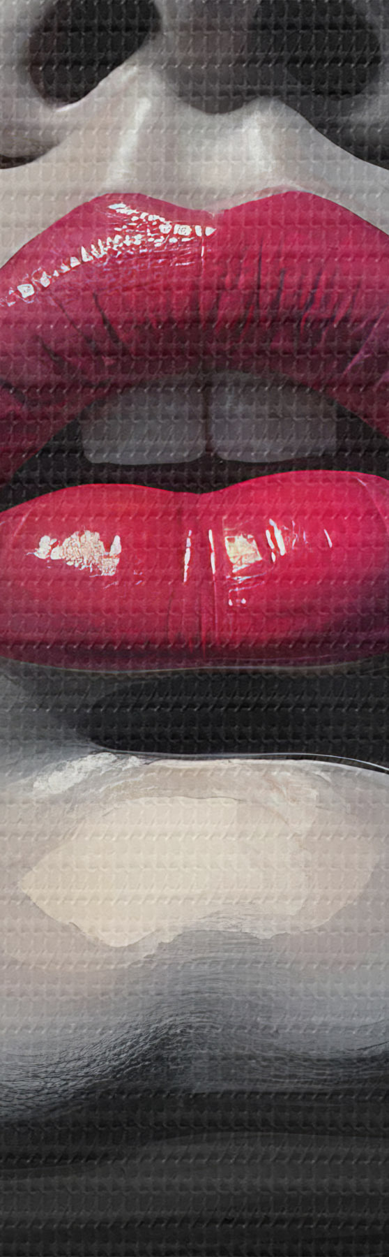Fototapete Abstraktes Porträt einer jungen Frau mit Sonnenbrille, rosa Lippen, abstrakten Formen und Spritzern in Rosa  s40558