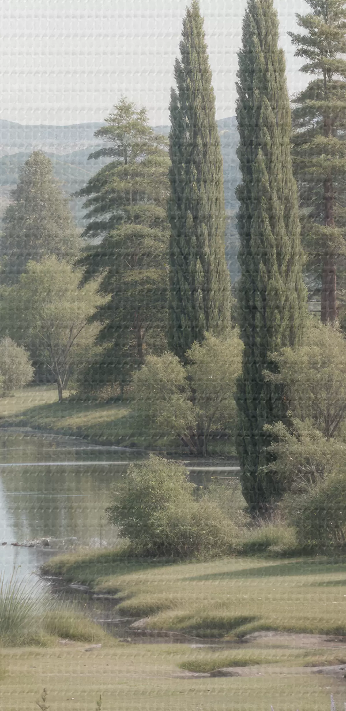 Fototapete Eine ruhige Landschaft mit einem ruhigen See, umgeben von Kiefern, Zypressen und anderer üppiger Vegetation s40579