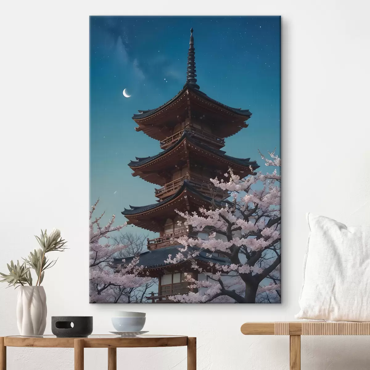Gemälde Eine traditionelle japanische Pagode mit einer Mondsichel am Himmel und blühenden Kirschblütenbäumen Art. s40586