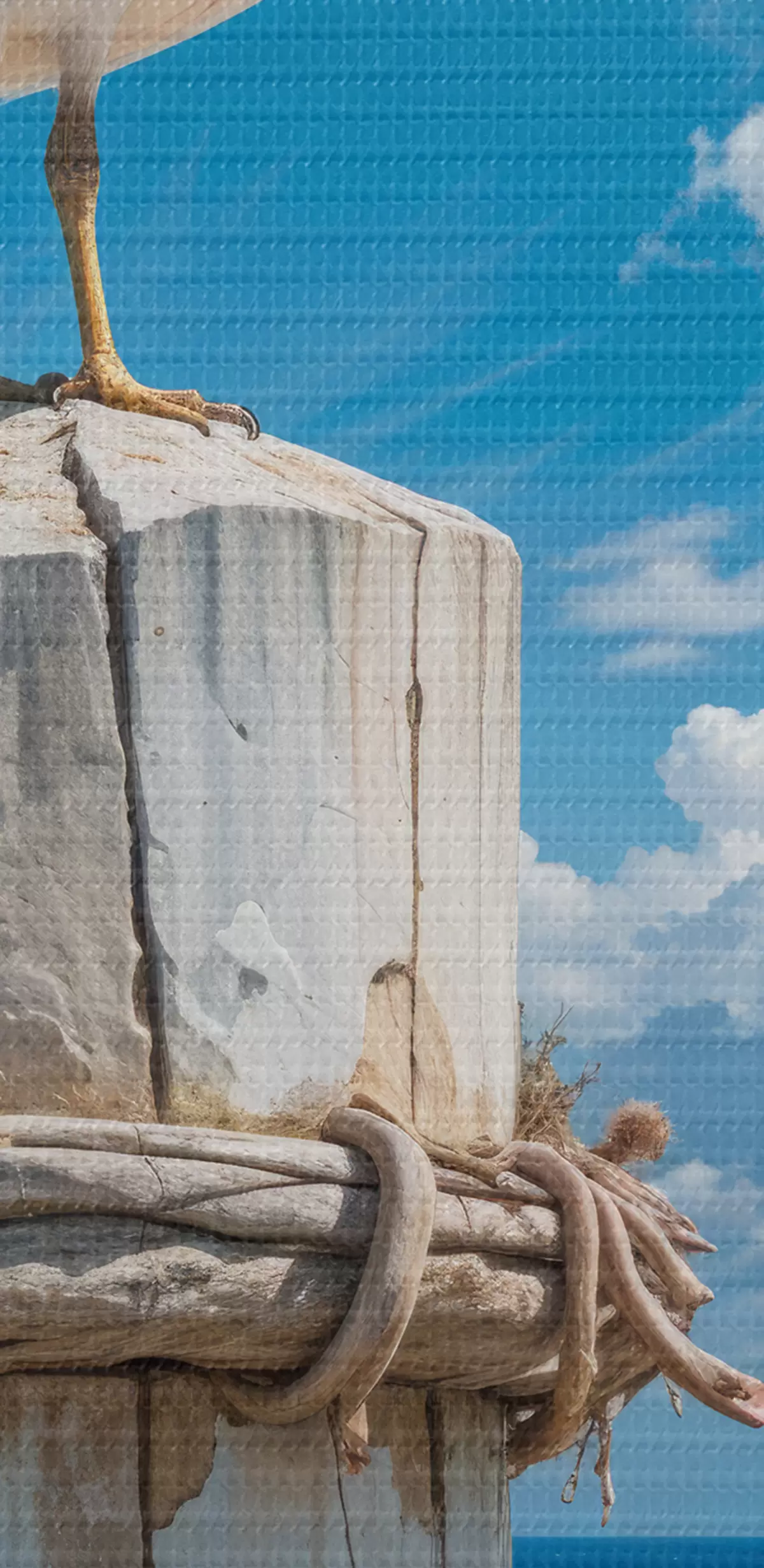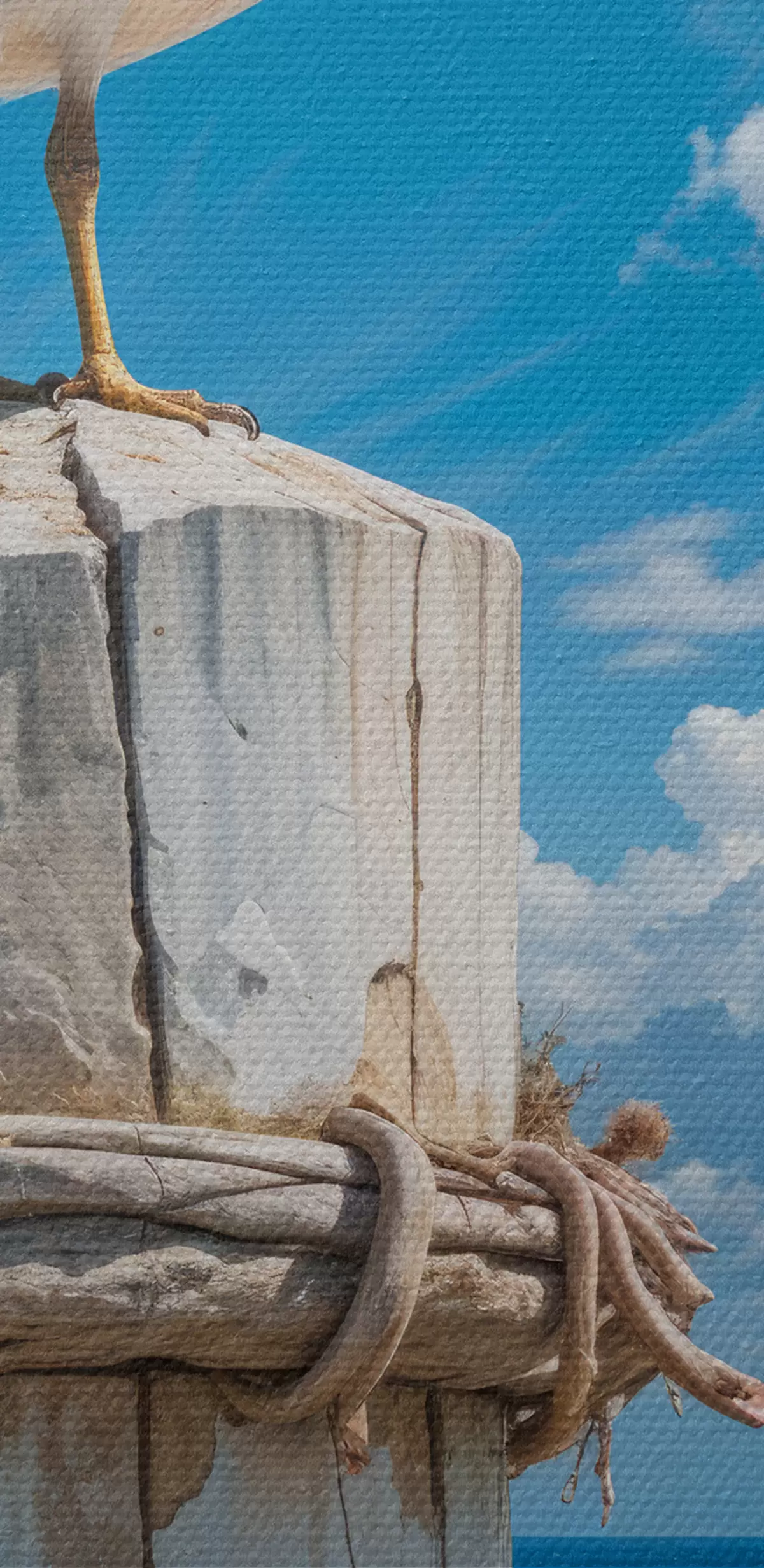 Gemälde Eine weiße Möwe sitzt auf einem Holzpfosten vor einem strahlend blauen Himmel und einem wogenden Meer Art. s40590