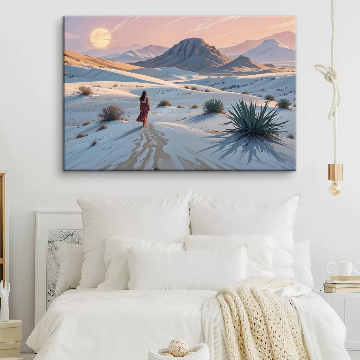 Gemälde Eine Frau in einem roten Kleid in einer Wüstenlandschaft mit einem Berg im Hintergrund und Sanddünen Art. s40603