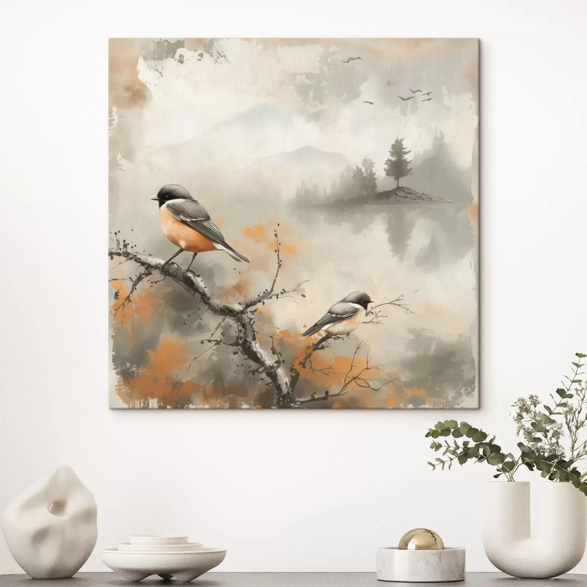 Gemälde Aquarelllandschaft mit Vögeln, die auf einem Zweig sitzen, in Pastellfarben Art. s40655