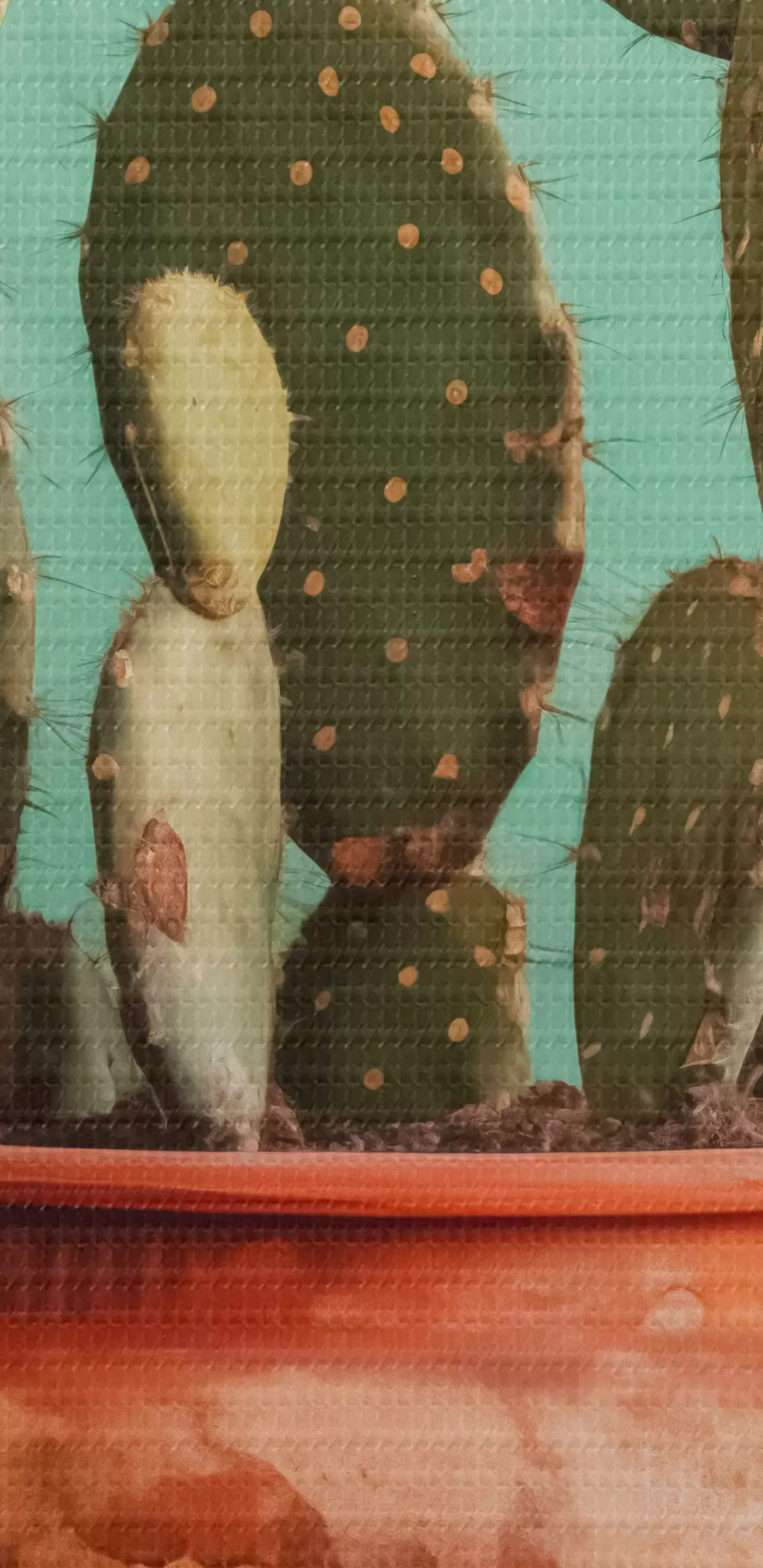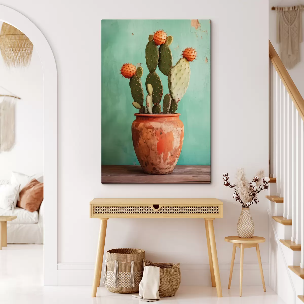 Gemälde Kaktus in einem alten Tontopf vor einer blaugrünen Wand Art. s40807