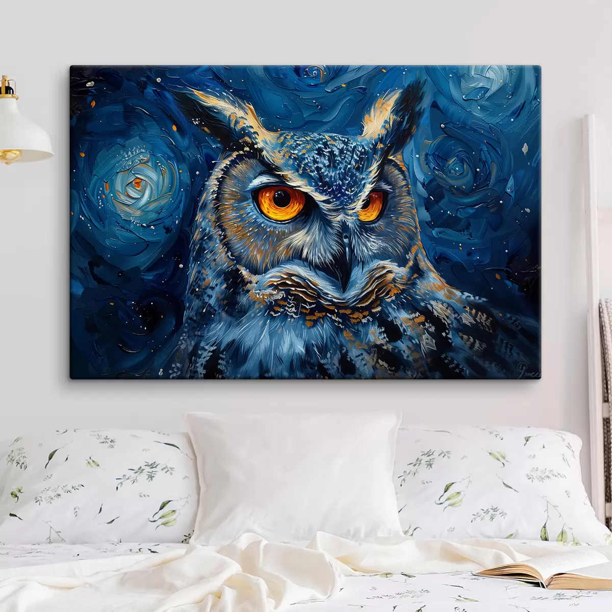 Gemälde Der Blick einer Eule bei Nacht mit einem Himmel im Van-Gogh-Stil Art. s40982