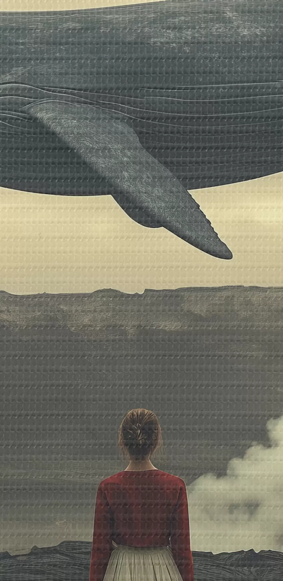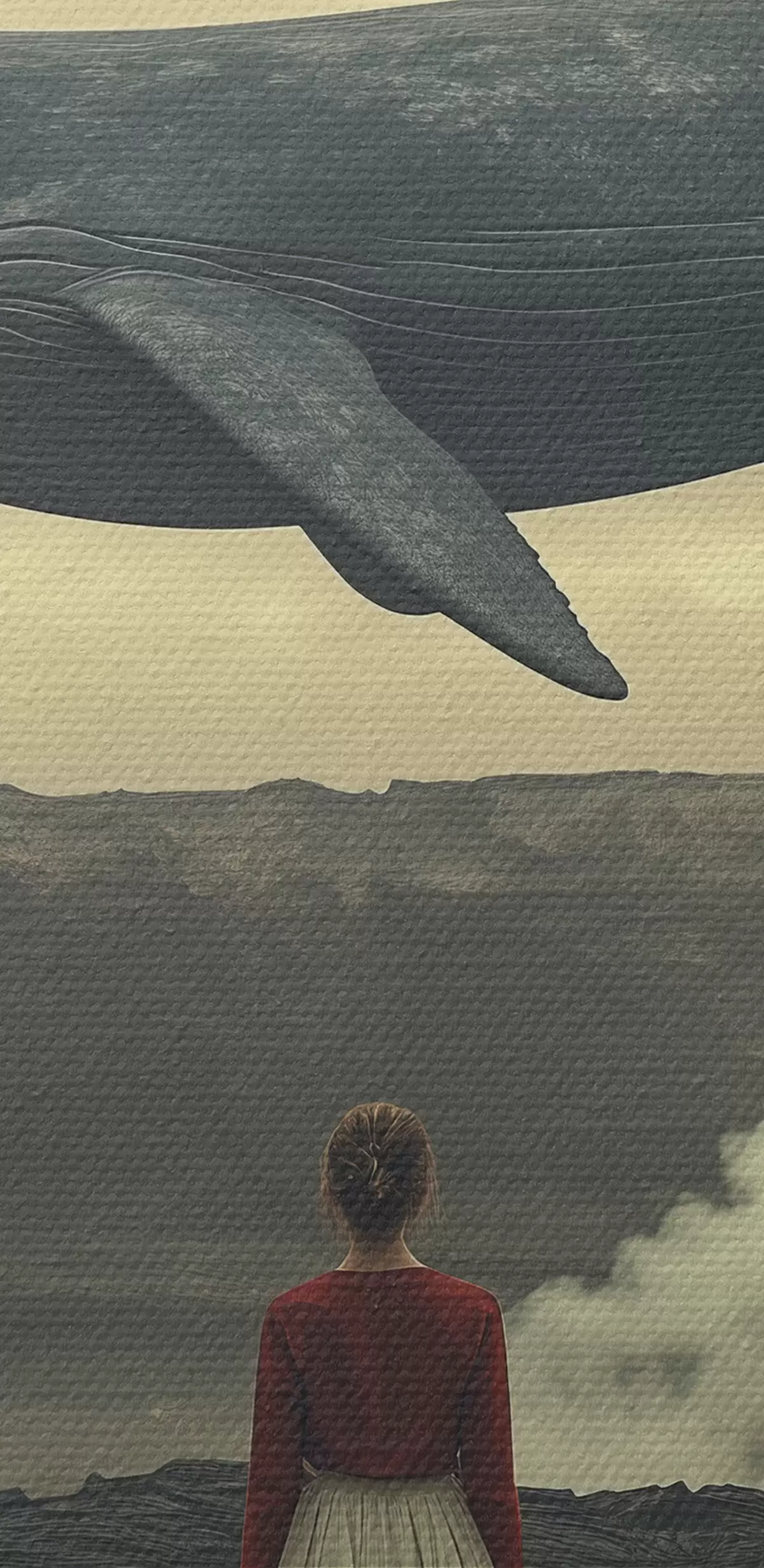 Gemälde Mädchen auf Lava mit einem großen fliegenden Wal am Himmel Art. s40986