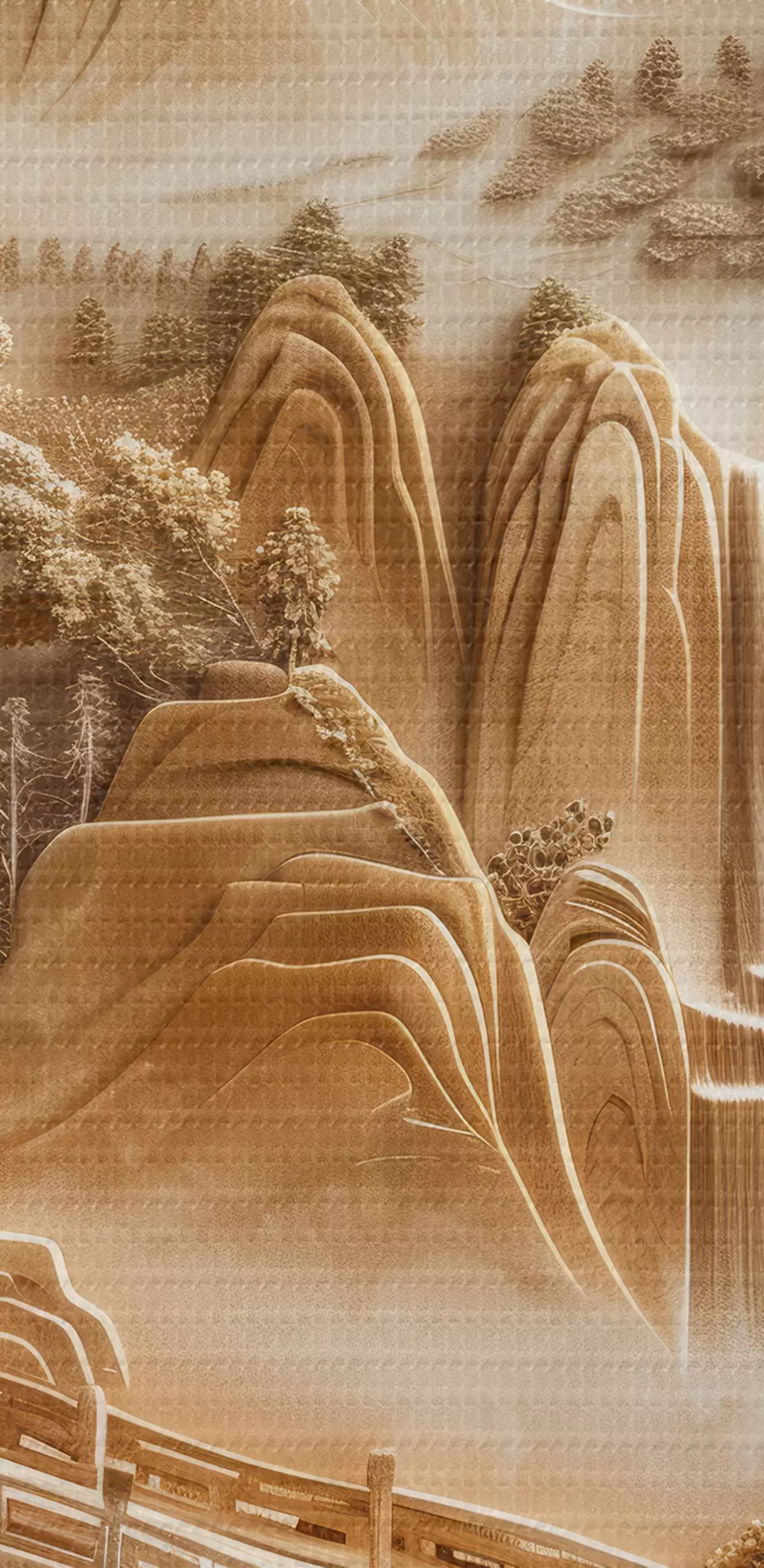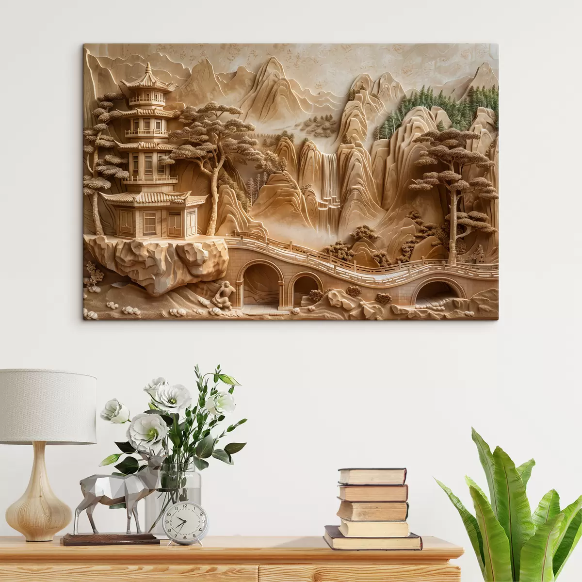 Fototapete Basrelief-Imitation: Berge mit Bäumen, eine Brücke und ein Tempel, mehrschichtig s40989