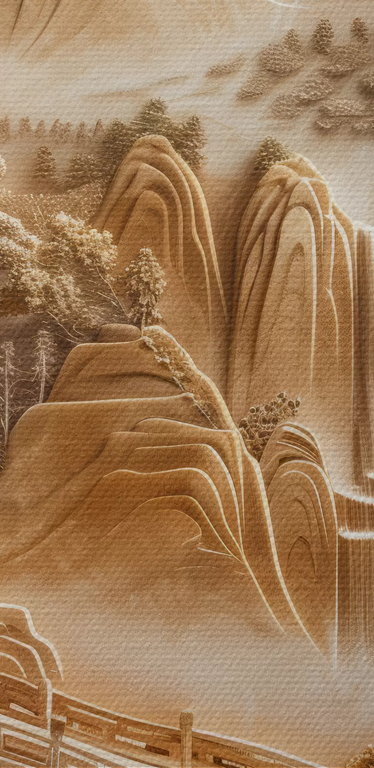 Gemälde Basrelief-Imitation: Berge mit Bäumen, eine Brücke und ein Tempel, mehrschichtig Art. s40989