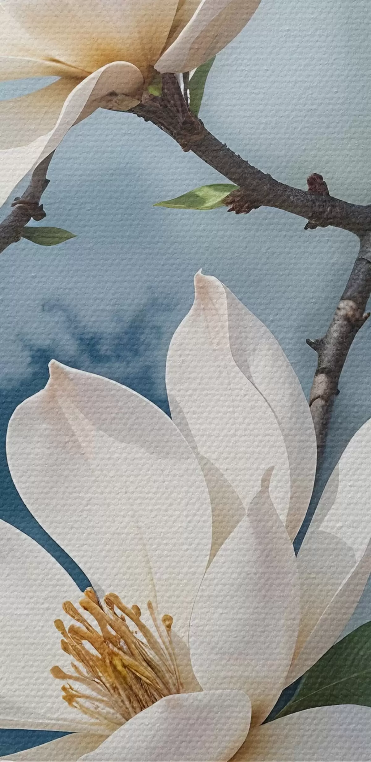 Fototapete Weiße Magnolienblüten auf Baumzweigen vor einem weichen aquarellblauen Himmelshintergrund s41081