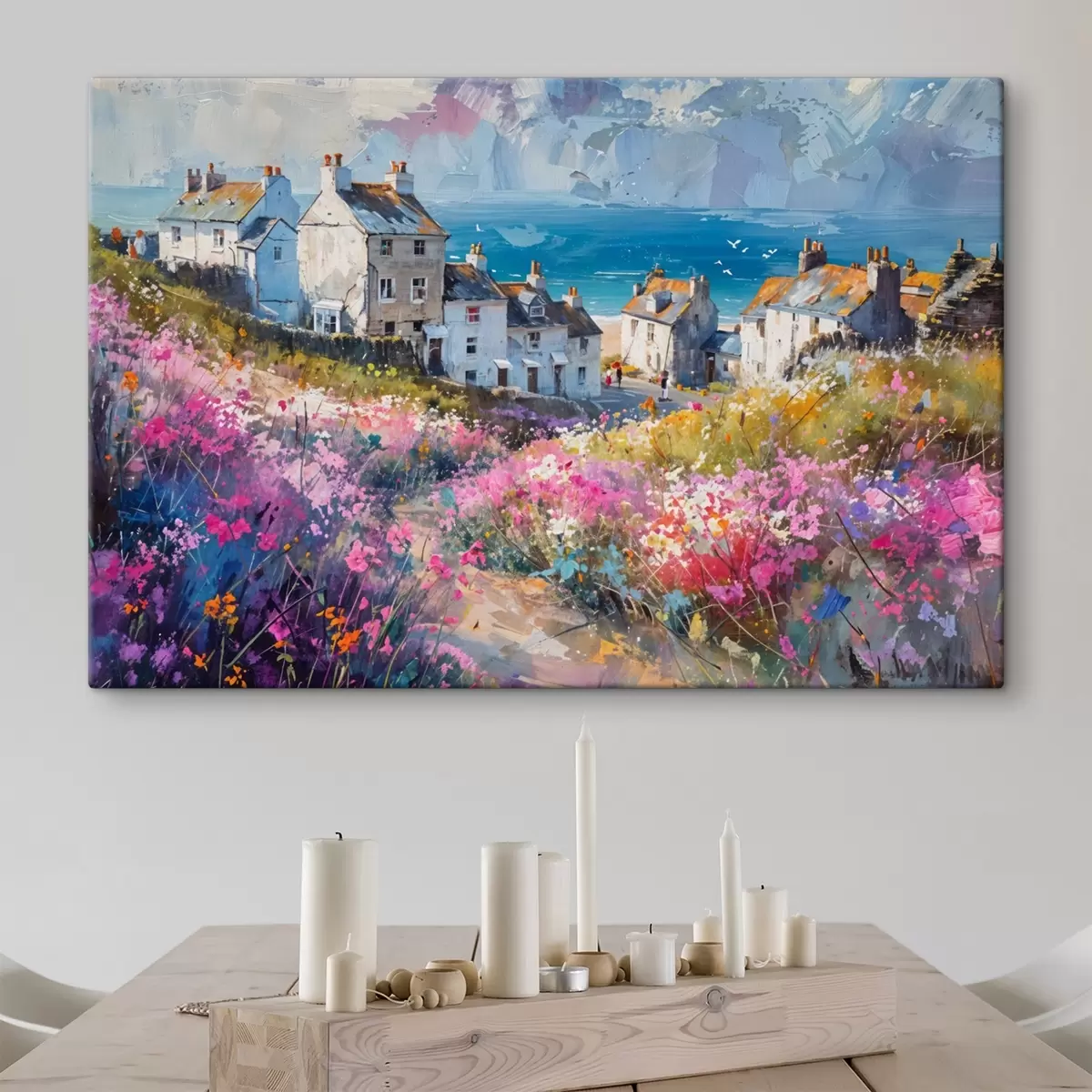 Gemälde Ein buntes Ölgemälde Küstenstadt mit weißen Häusern und einem lebendigen Blumengarten im Vordergrund Art. s41090