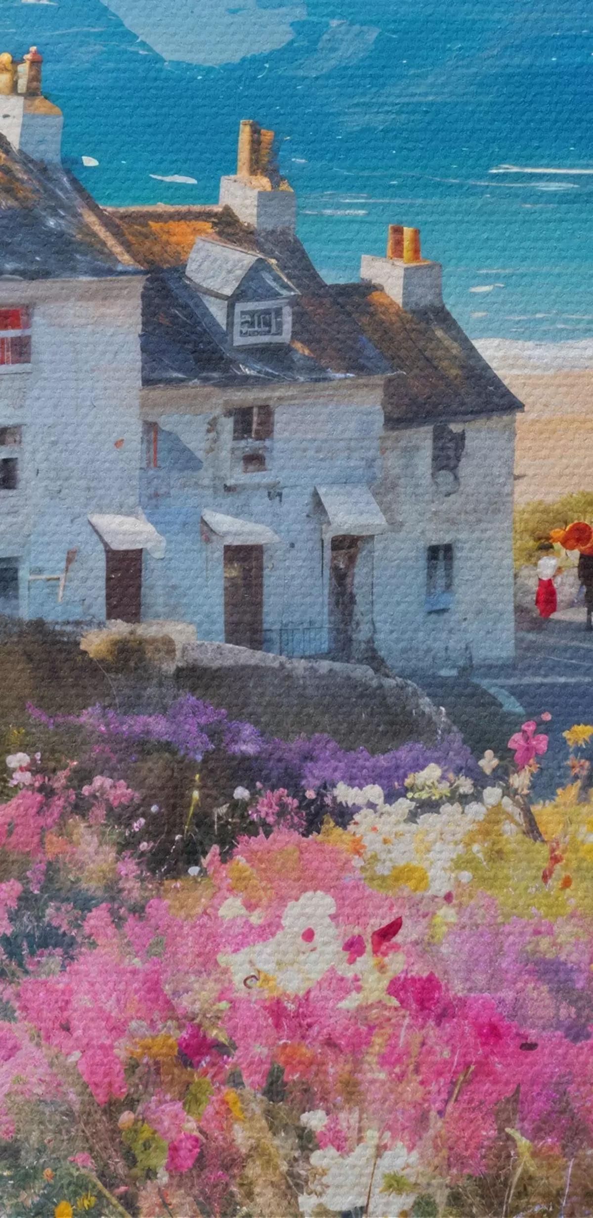 Fototapete Ein buntes Ölgemälde Küstenstadt mit weißen Häusern und einem lebendigen Blumengarten im Vordergrund s41090