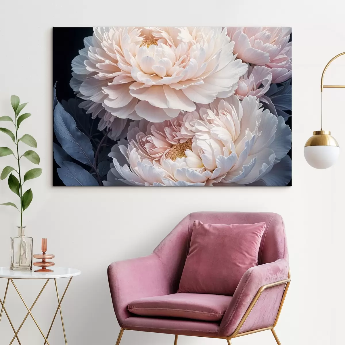 Gemälde Zarte pastellrosa Pfingstrosen mit weichen, flauschigen Blütenblättern und blauen Blättern vor dunklem Hintergrund Art. s41092