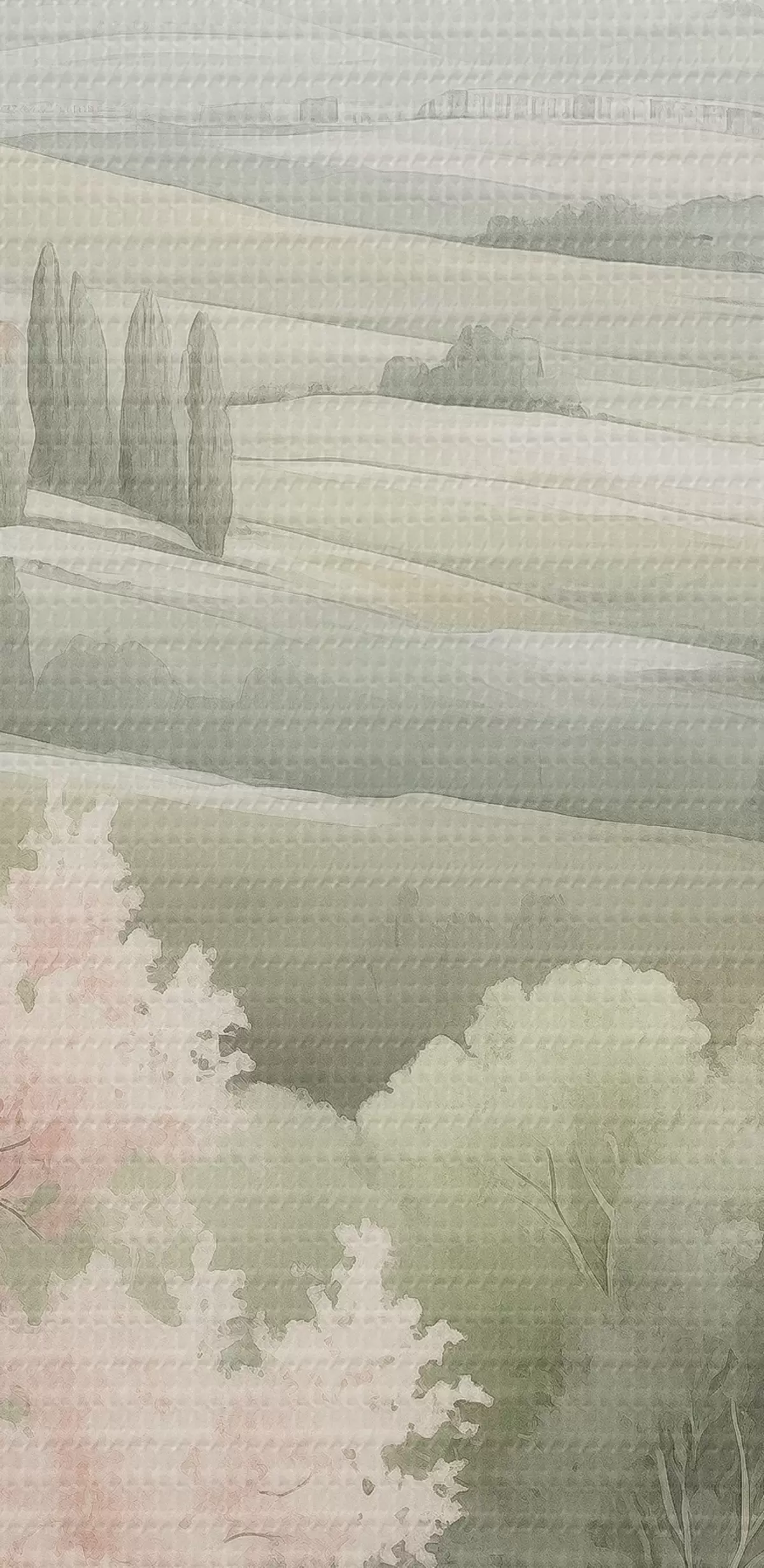 Fototapete Aquarell Natur, weiche Farben, Rosen, Bäume, grüne Hügel s41223