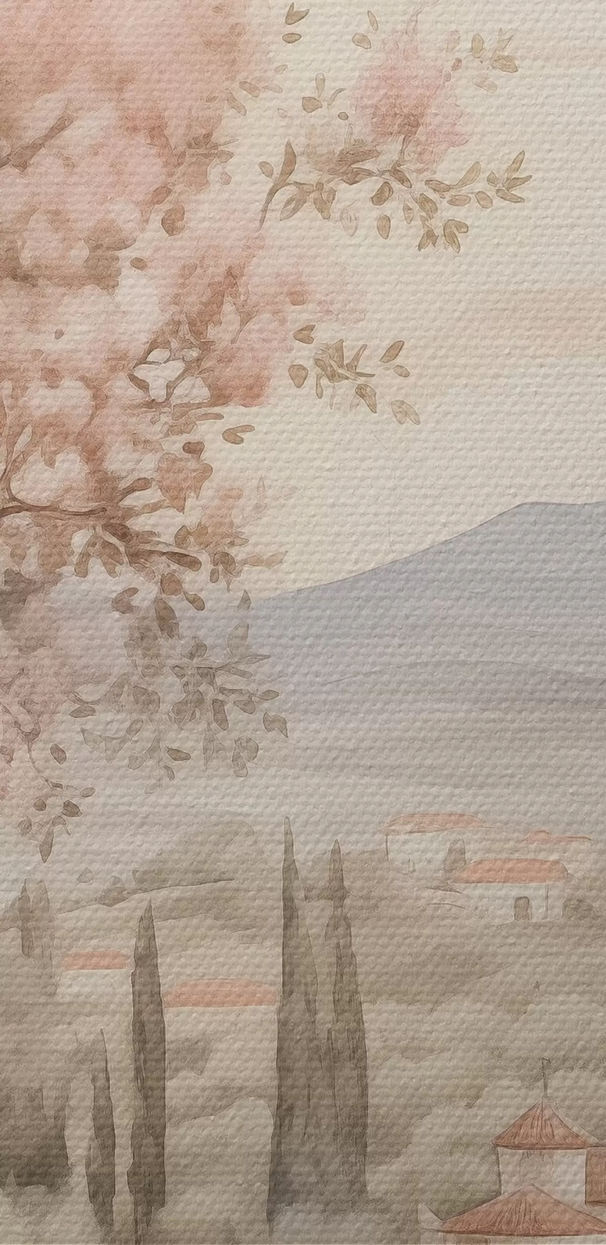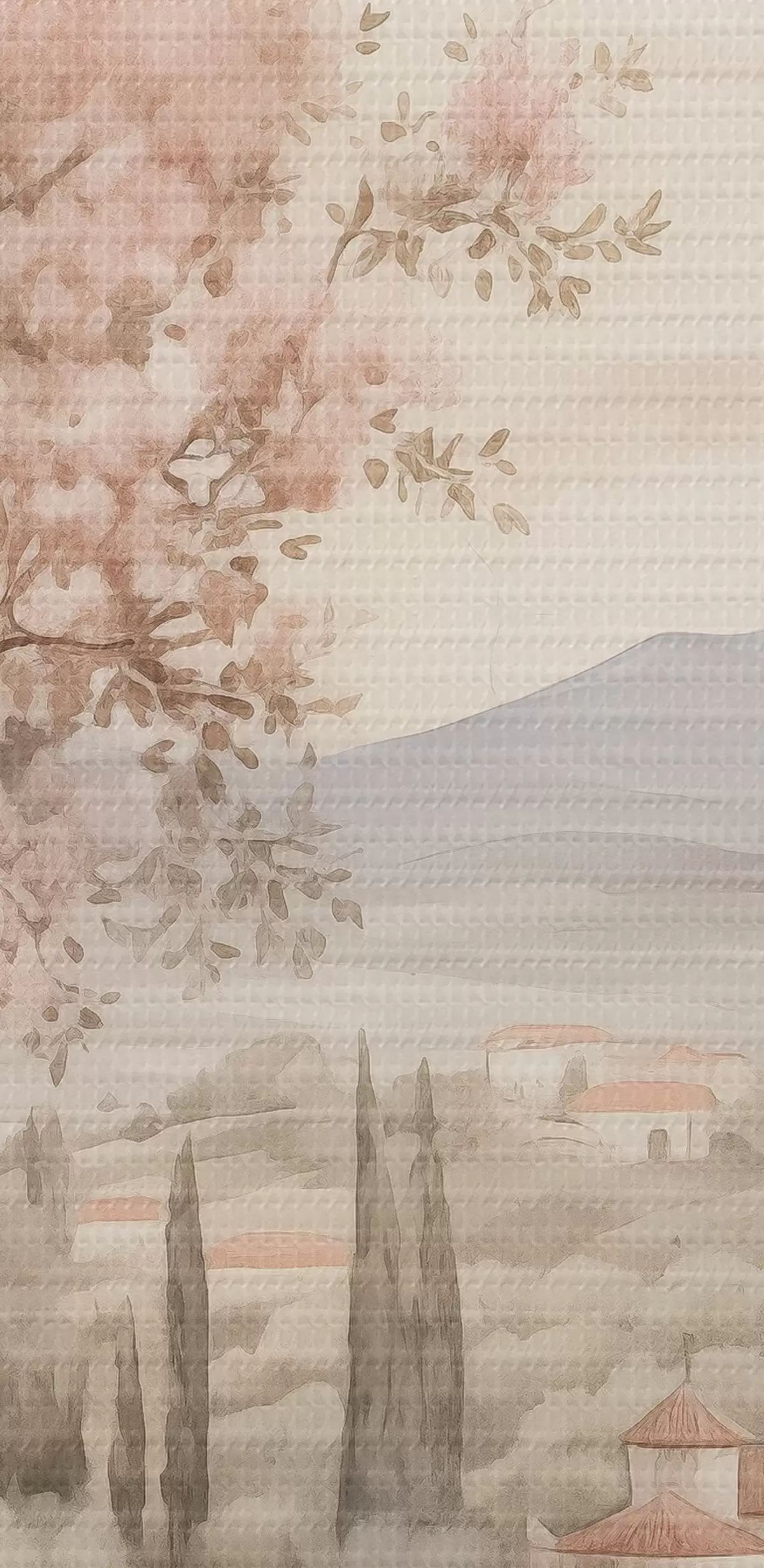 Fototapete Aquarell Hügel, blühender Kirschbaum, Schloss, rustikaler Stil s41225
