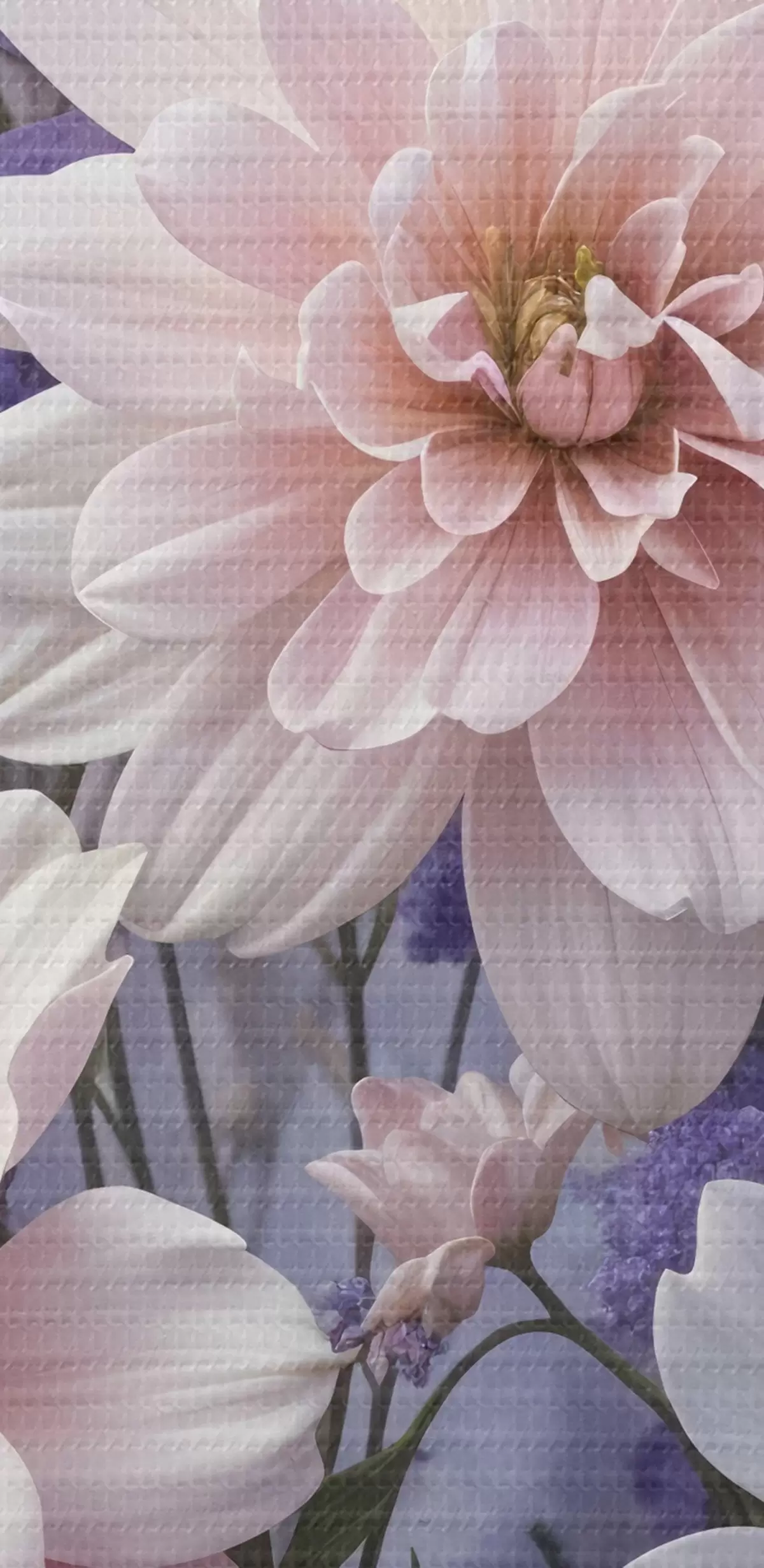 Fototapete Ein Strauß großer, leuchtender Dahlienblüten in rosa, lavendelfarbenen und weißen Tönen vor einem weichen, unscharfen Hintergrund s41247