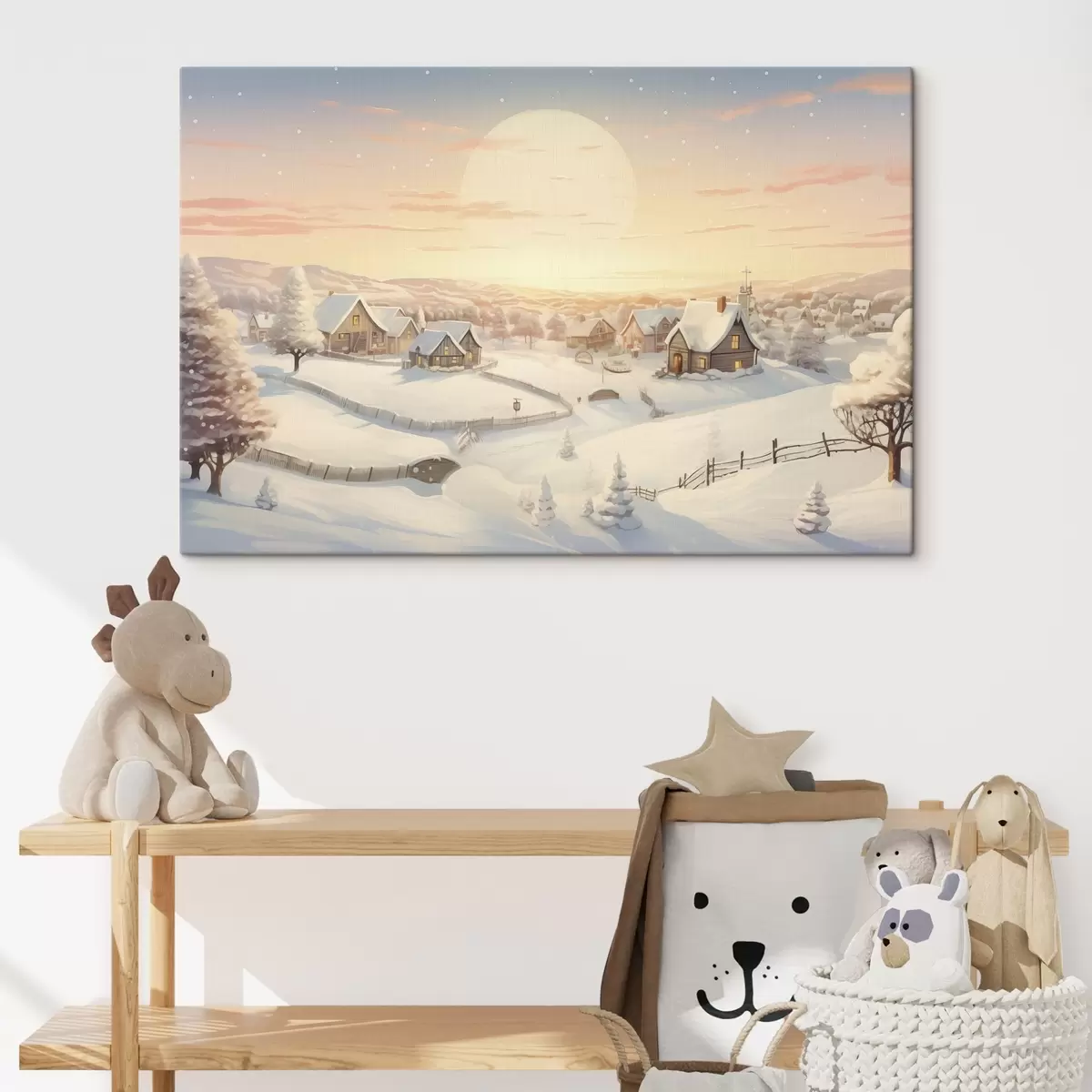 Gemälde Winterdorf im Sonnenuntergang, schneebedeckte Häuser, Tannenbäume Art. s41380