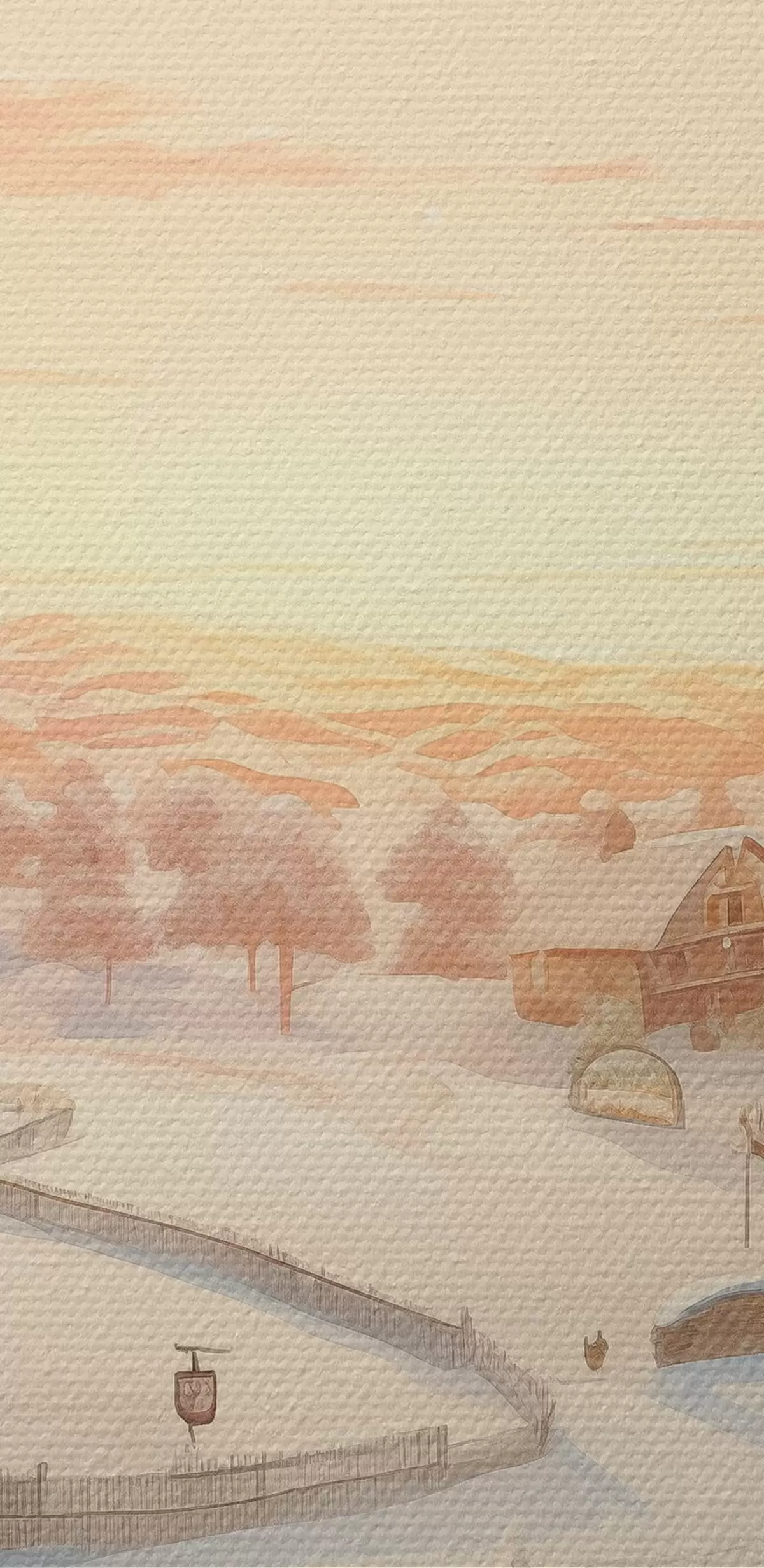 Gemälde Winterdorf im Sonnenuntergang, schneebedeckte Häuser, Tannenbäume Art. s41380