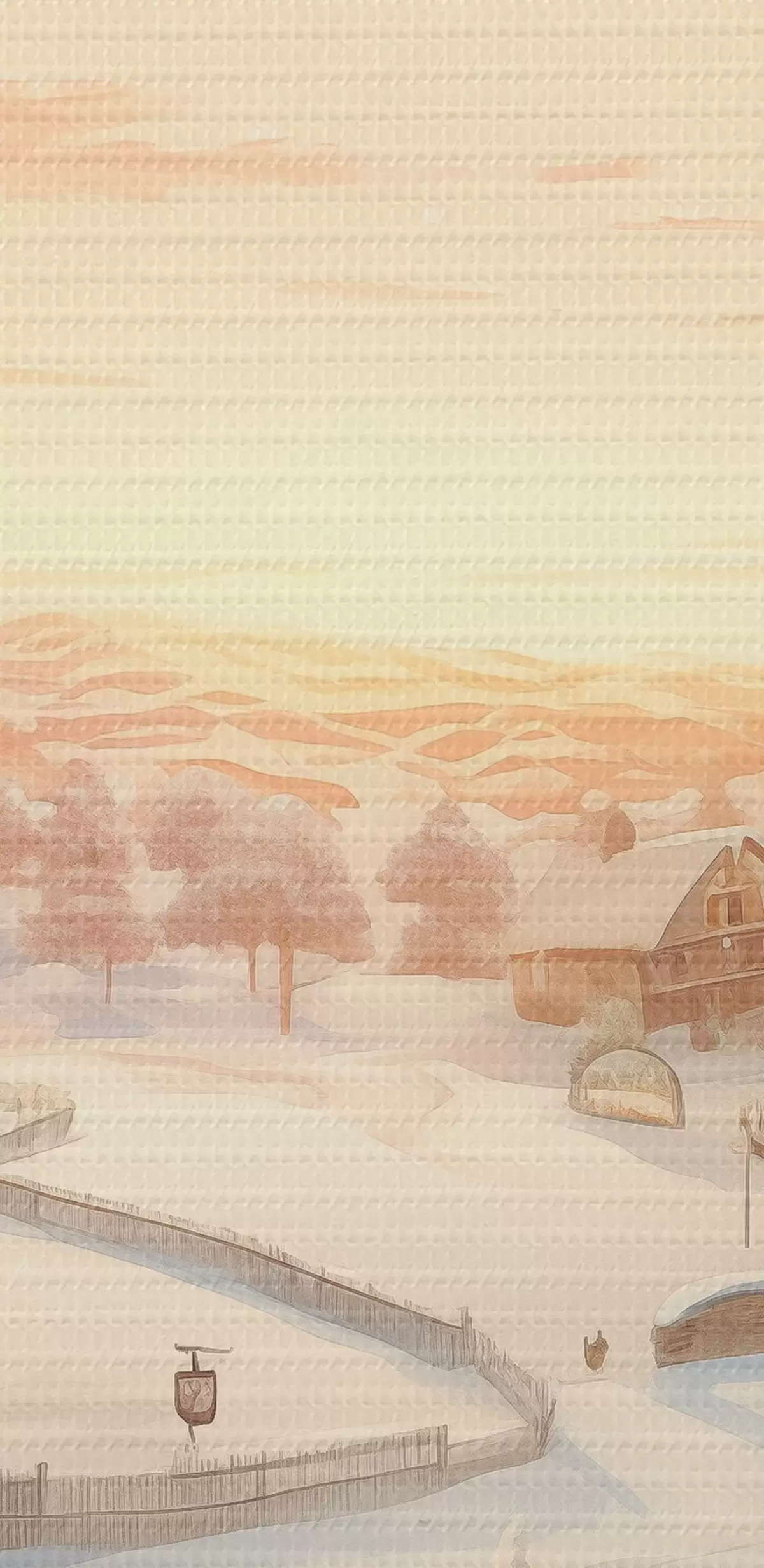 Fototapete Winterdorf im Sonnenuntergang, schneebedeckte Häuser, Tannenbäume s41380
