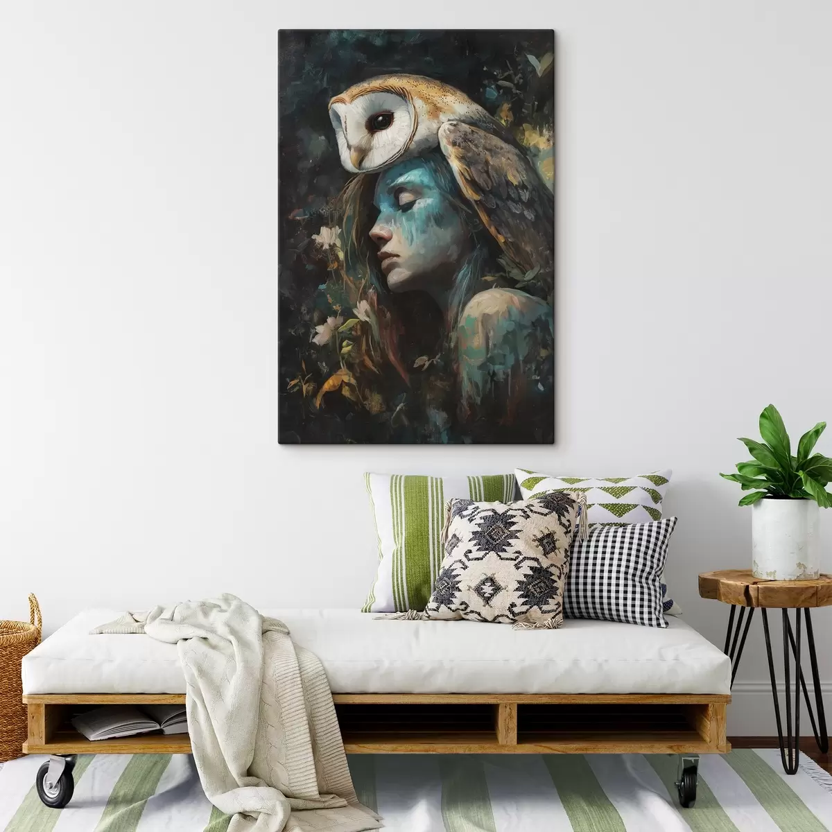 Fototapete Ölzeichnung, schöne Eule mit junger Frau, floral s41446