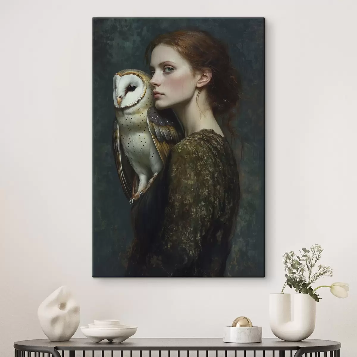 Gemälde Frauenporträt mit Eule auf der Schulter, Pinselstriche, Acryl Art. s41447