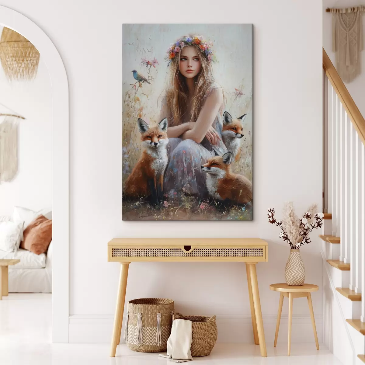Gemälde Mädchen auf der Wiese, wilde Tiere, Füchse, Vögel, Blumenkranz Art. s41451