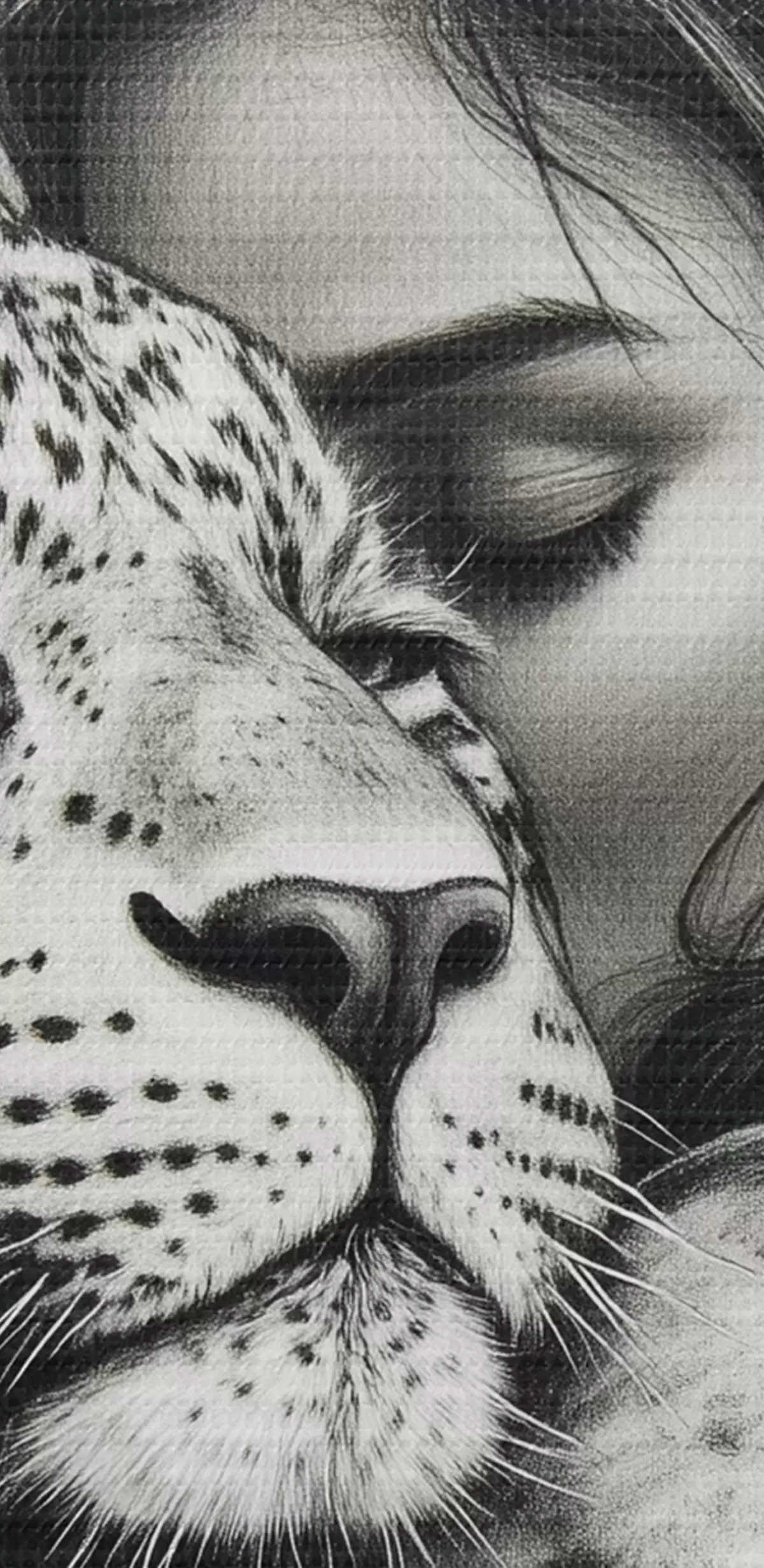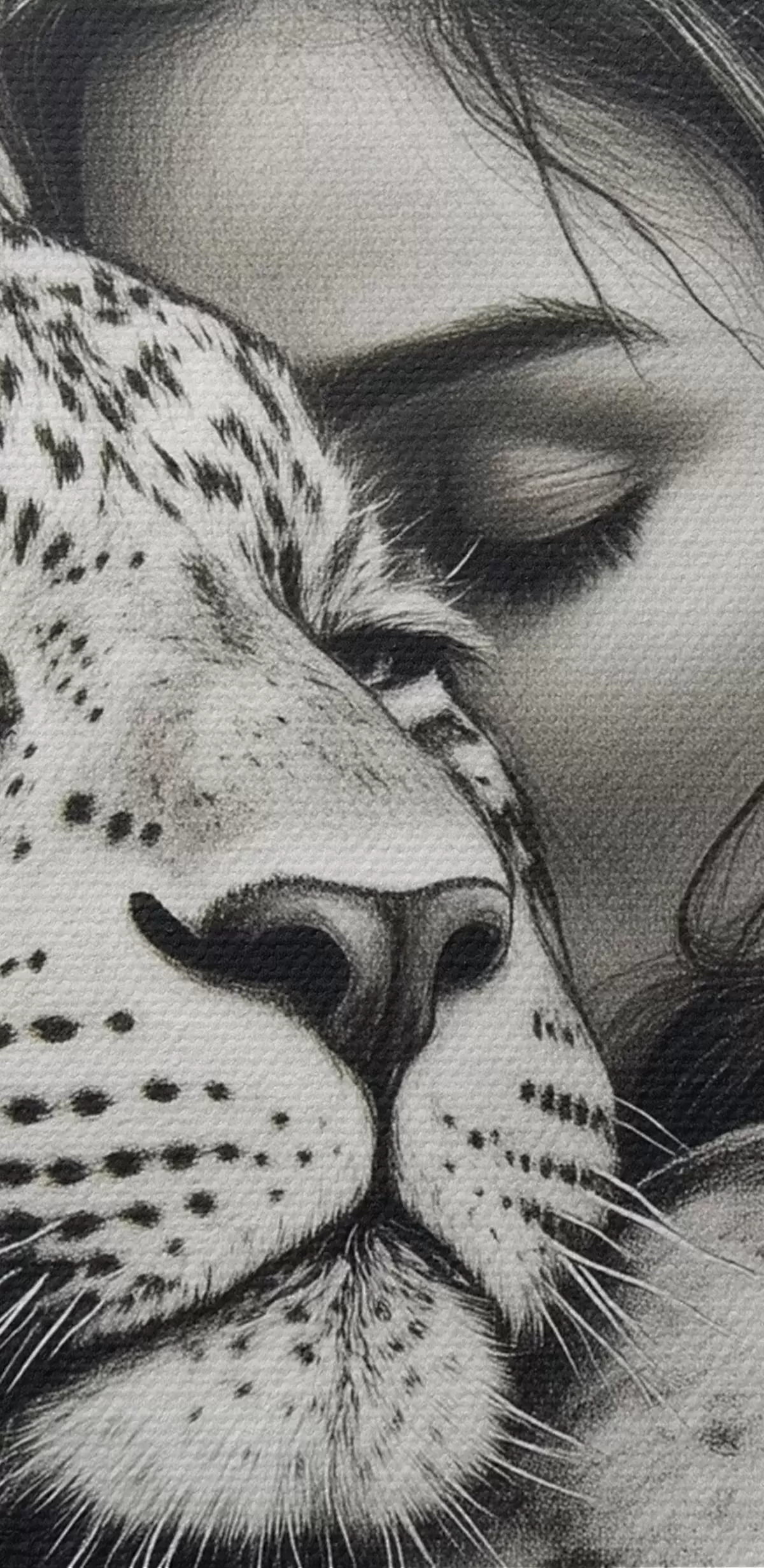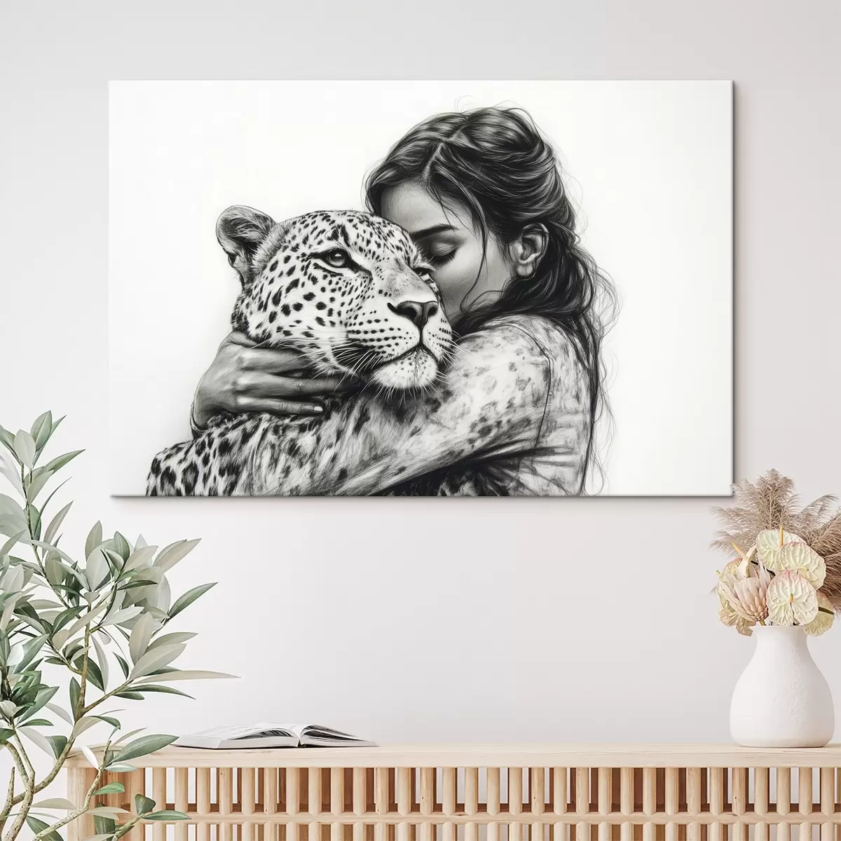 Gemälde Frau mit Leopard, wilde Tiere, Bleistiftzeichnung, schwarz-weiß Art. s41455