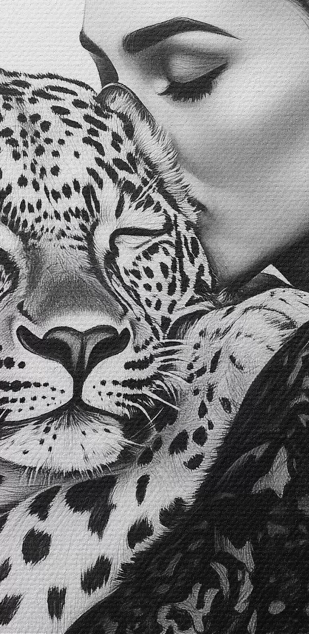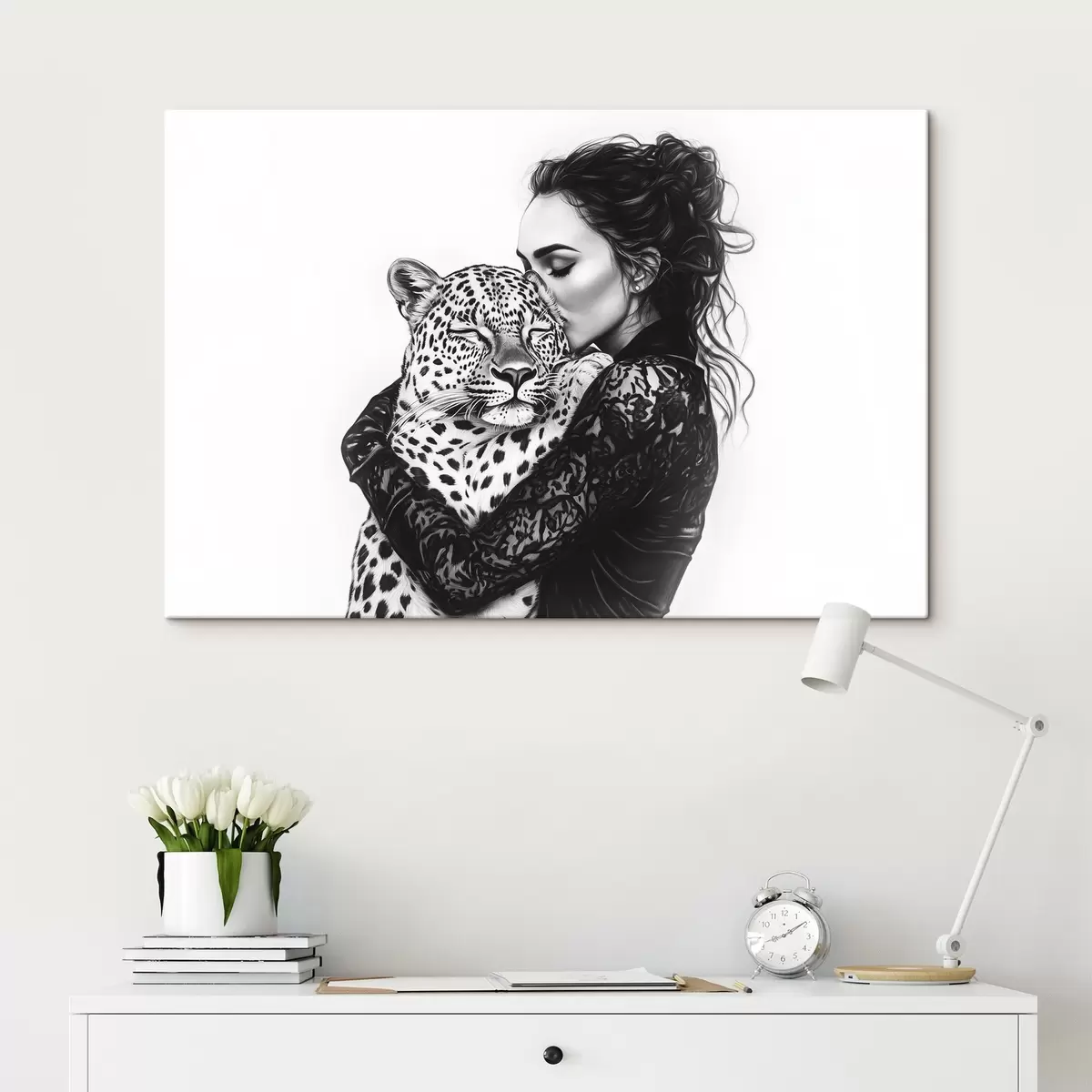 Gemälde Frau küsst Leopard, Bleistiftzeichnung, wilde Tiere, schwarz-weiß Art. s41457