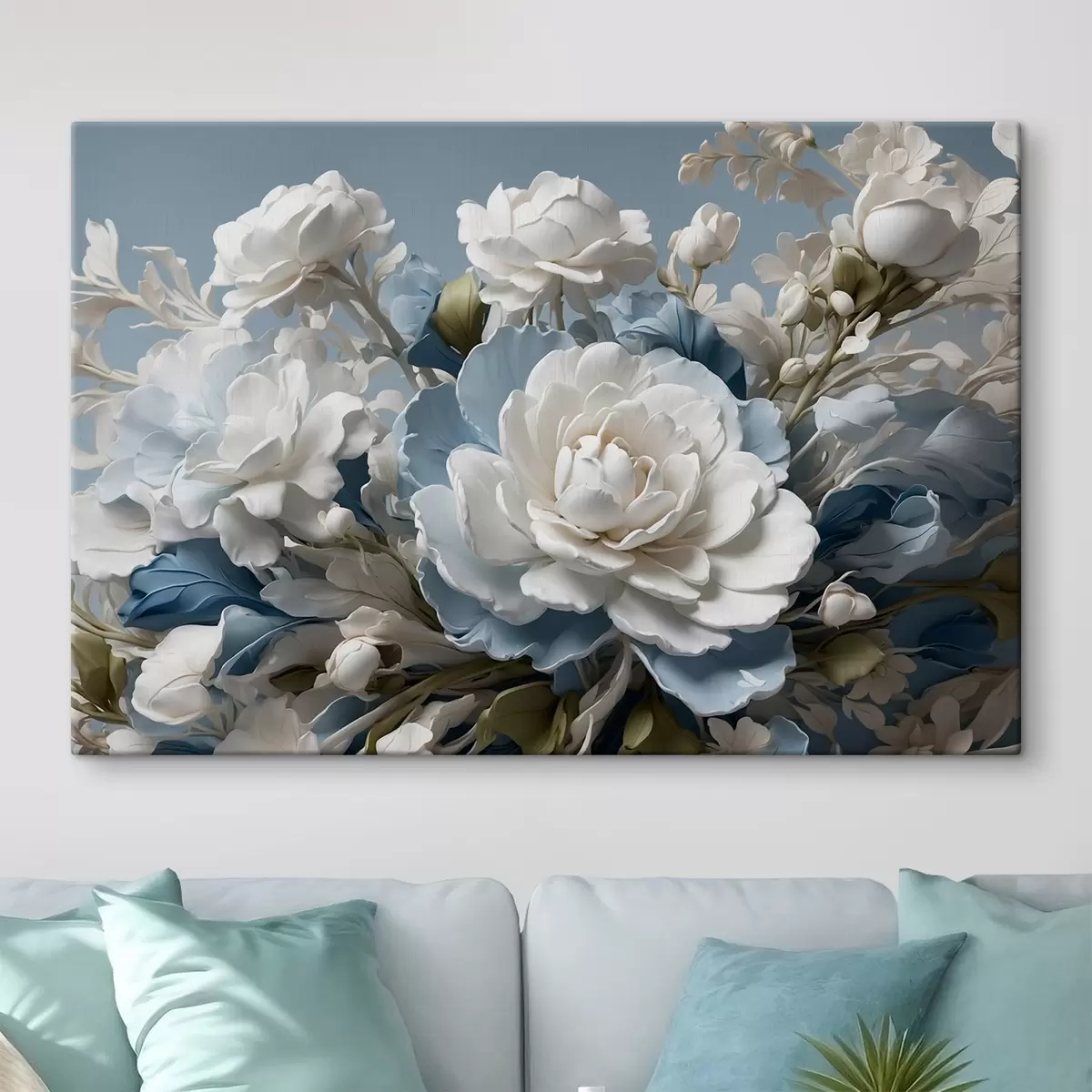 Gemälde Weiße Blumen und Blätter auf blauem Hintergrund Art. s41527