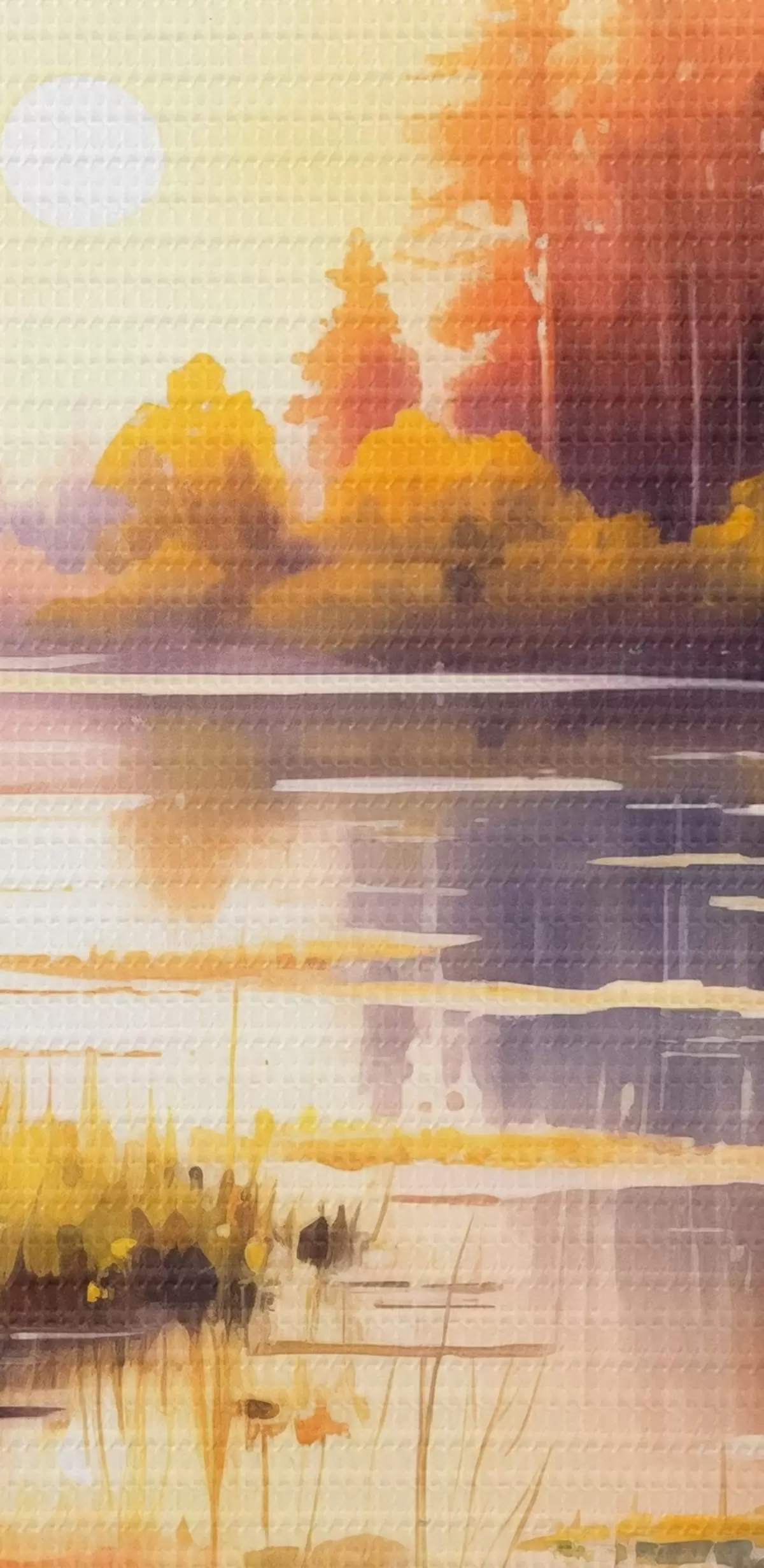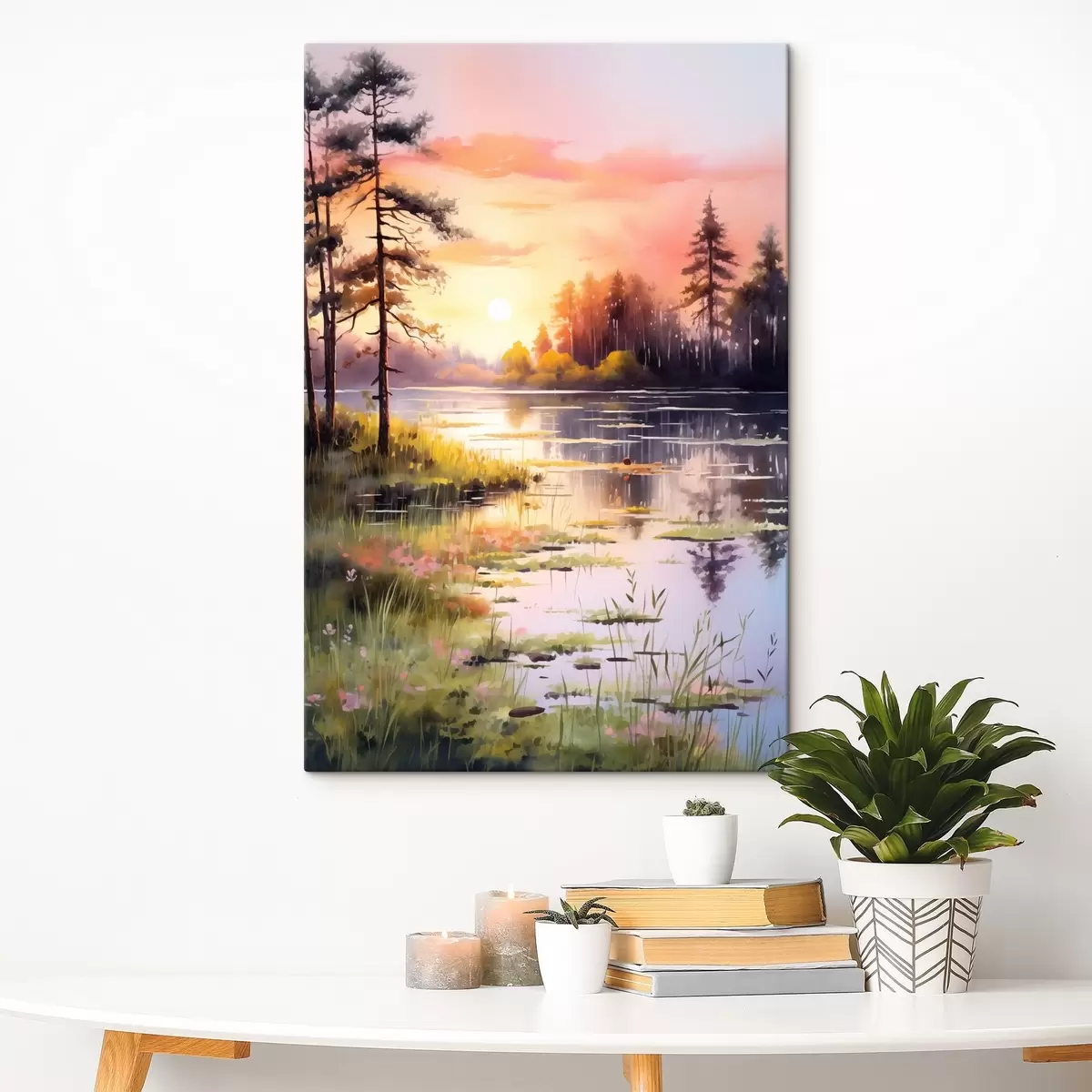 Fototapete Sonnenaufgang auf dem Waldsee, Aquarell, Bäume, Blumen, sanftes Licht s41644
